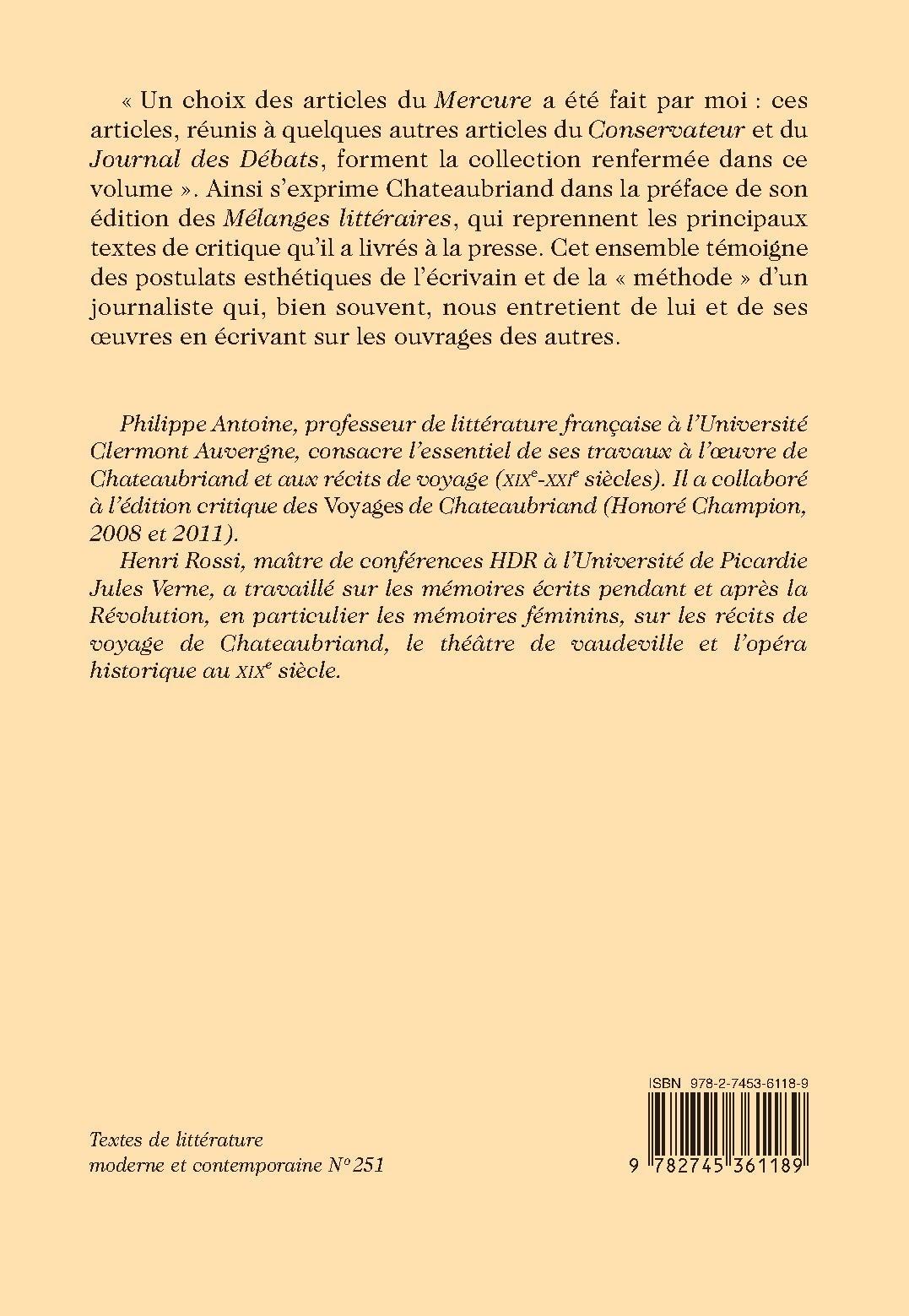 « Un choix des articles du Mercure a été fait par moi : ces articles, réunis à quelques autres articles du Conservateur et du Journal des Débats, forment la collection renfermée dans ce volume ». Ainsi s’exprime Chateaubriand dans la préface de son édition des Mélanges littéraires, qui reprennent les principaux textes de critique qu’il a livrés à la presse. Cet ensemble témoigne des postulats esthétiques de l’écrivain et de la « méthode » d’un journaliste qui, bien souvent, nous entretient de lui et de ses œuvres en écrivant sur les ouvrages des autres.
