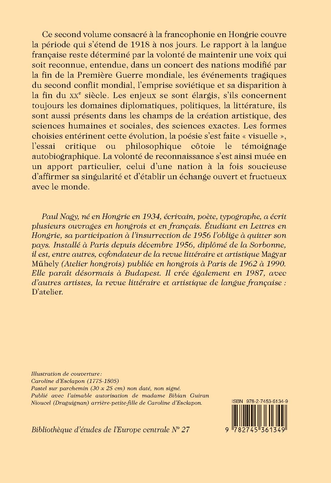 Ce second volume consacré à la francophonie en Hongrie couvre la période qui s’étend de 1918 à nos jours. Le rapport à la langue française reste déterminé par la volonté de maintenir une voix qui soit reconnue, entendue, dans un concert des nations modifié par la fin de la Première Guerre mondiale, les événements tragiques du second conflit mondial, l’emprise soviétique et sa disparition à la fin du XXe siècle. Les enjeux se sont élargis, s’ils concernent toujours les domaines diplomatiques, politiques, la littérature, ils sont aussi présents dans les champs de la création artistique, des sciences humaines et sociales, des sciences exactes. Les formes choisies entérinent cette évolution, la poésie s’est faite « visuelle », l’essai critique ou philosophique côtoie le témoignage autobiographique. La volonté de reconnaissance s’est ainsi muée en un apport particulier, celui d’une nation à la fois soucieuse d’affirmer sa singularité et d’établir un échange ouvert et fructueux avec le monde.