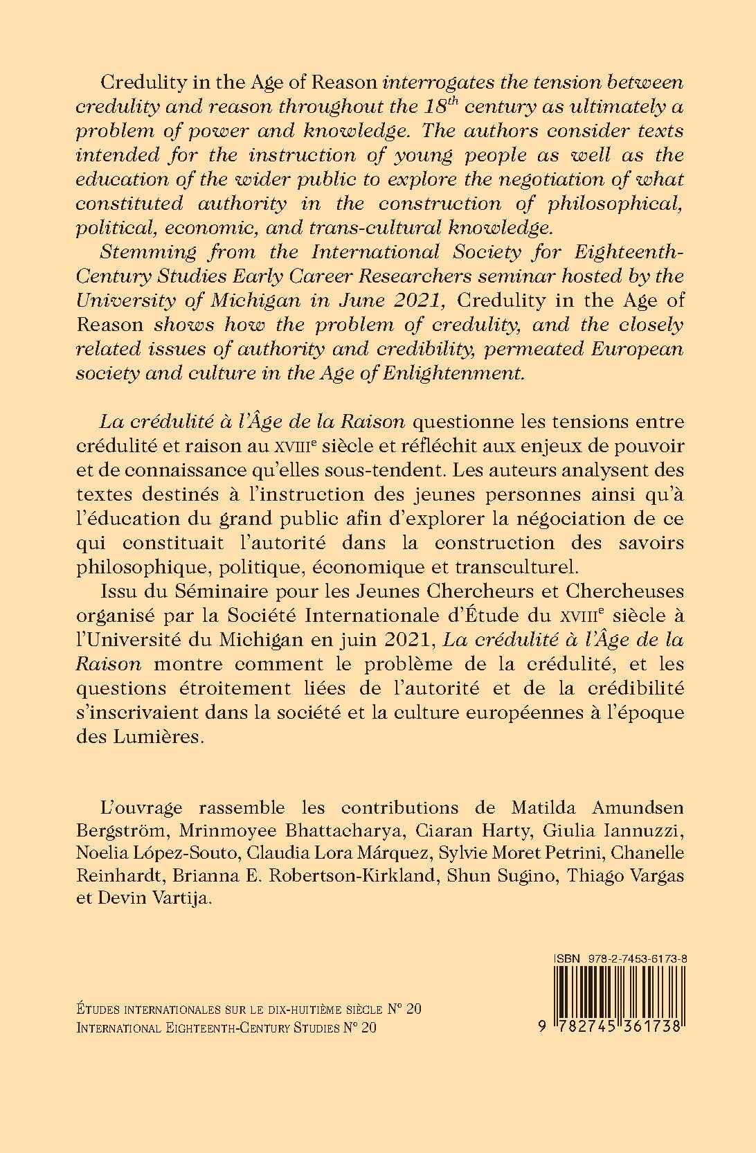 Stemming from the International Society for Eighteenth- Century Studies Early Career Researchers seminar hosted by the University of Michigan in June 2021, Credulity in the Age of Reason shows how the problem of credulity, and the closely related issues of authority and credibility, permeated European society and culture in the Age of Enlightenment.