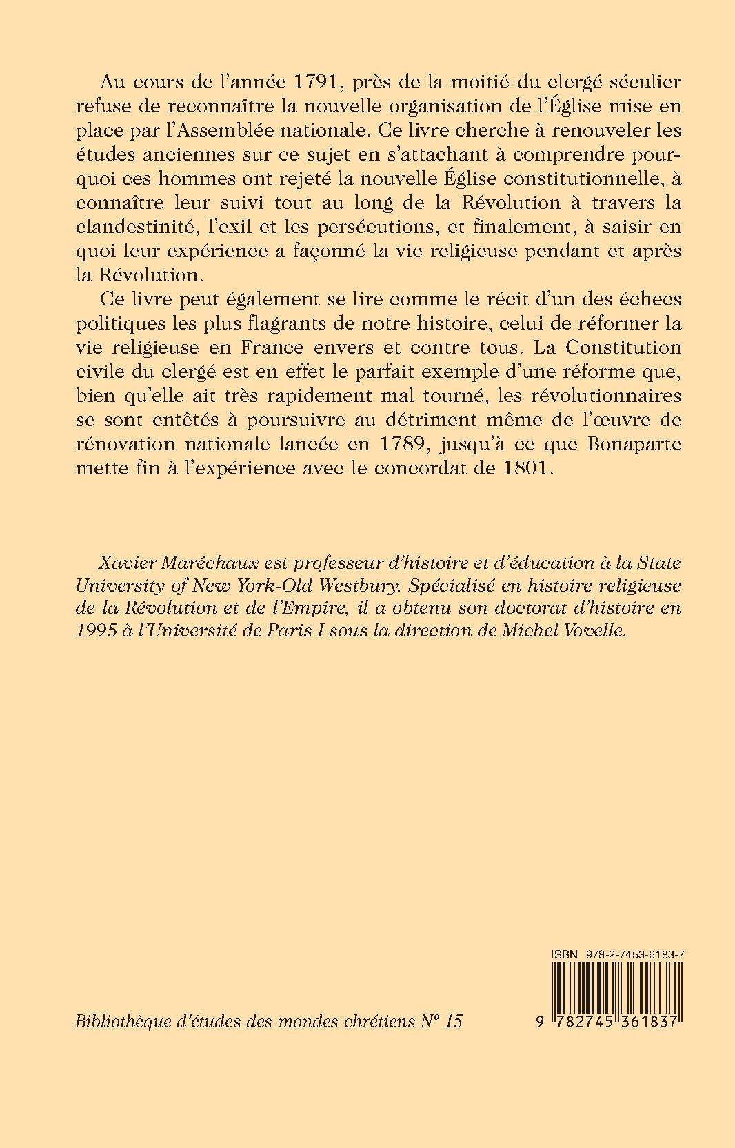 Au cours de l’année 1791, près de la moitié du clergé séculier refuse de reconnaître la nouvelle organisation de l’Église mise en place par l’Assemblée nationale. Ce livre cherche à renouveler les études anciennes sur ce sujet en s’attachant à comprendre pourquoi ces hommes ont rejeté la nouvelle Église constitutionnelle, à connaître leur suivi tout au long de la Révolution à travers la clandestinité, l’exil et les persécutions, et finalement, à saisir en quoi leur expérience a façonné la vie religieuse pendant et après la Révolution.