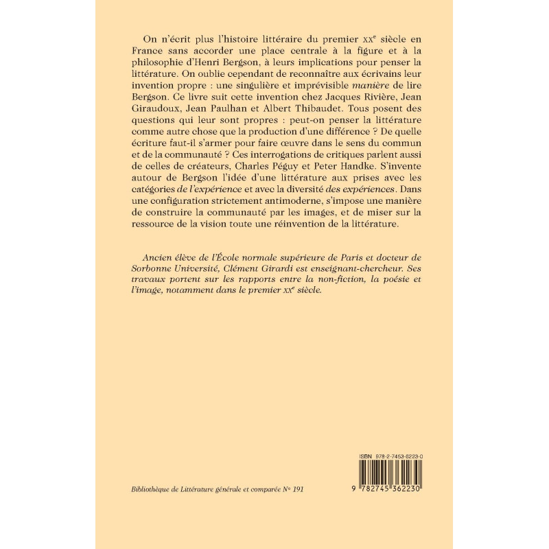 On n’écrit plus l’histoire littéraire du premier XXe siècle en France sans accorder une place centrale à la figure et à la philosophie d’Henri Bergson, à leurs implications pour penser la littérature. On oublie cependant de reconnaître aux écrivains leur invention propre : une singulière et imprévisible manière de lire Bergson. Ce livre suit cette invention chez Jacques Rivière, Jean Giraudoux, Jean Paulhan et Albert Thibaudet. Tous posent des questions qui leur sont propres : peut-on penser la littérature comme autre chose que la production d’une différence ? De quelle écriture faut-il s’armer pour faire œuvre dans le sens du commun et de la communauté ? Ces interrogations de critiques parlent aussi de celles de créateurs, Charles Péguy et Peter Handke. S’invente autour de Bergson l’idée d’une littérature aux prises avec les catégories de l’expérience et avec la diversité des expériences. Dans une configuration strictement antimoderne, s’impose une manière de construire la communauté par les images, et de miser sur la ressource de la vision toute une réinvention de la littérature.
