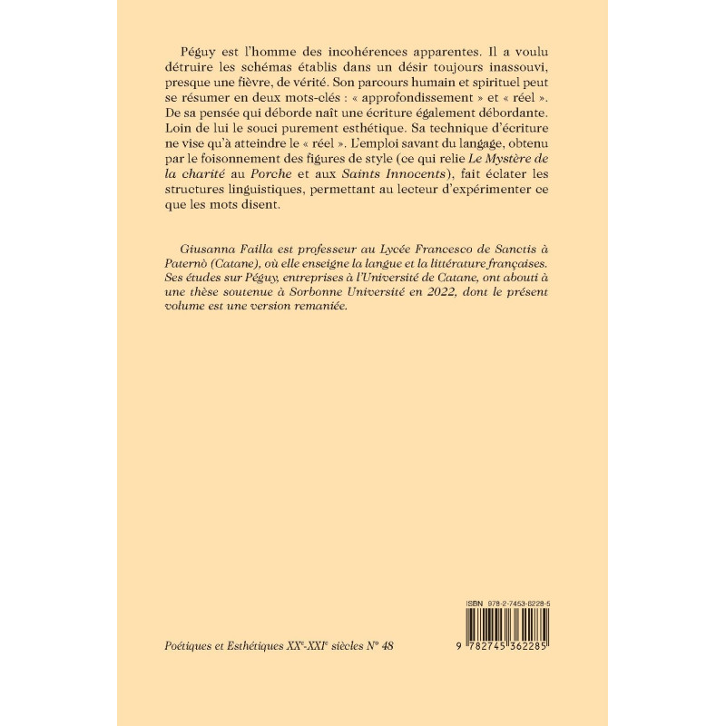 Giusanna Failla est professeur au Lycée Francesco de Sanctis à Paternò (Catane), où elle enseigne la langue et la littérature françaises. Ses études sur Péguy, entreprises à l’Université de Catane, ont abouti à une thèse soutenue à Sorbonne Université en 2022, dont le présent volume est une version remaniée.