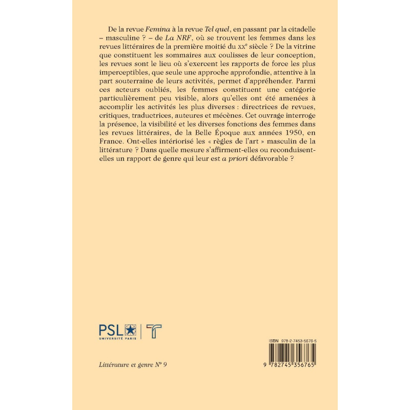 De la revue Femina à la revue Tel quel, en passant par la citadelle – masculine ? – de La NRF, où se trouvent les femmes dans les revues littéraires de la première moitié du XXe siècle ? De la vitrine que constituent les sommaires aux coulisses de leur conception, les revues sont le lieu où s’exercent les rapports de force les plus imperceptibles, que seule une approche approfondie, attentive à la part souterraine de leurs activités, permet d’appréhender. Parmi ces acteurs oubliés, les femmes constituent une catégorie particulièrement peu visible, alors qu’elles ont été amenées à accomplir les activités les plus diverses : directrices de revues, critiques, traductrices, auteures et mécènes. Cet ouvrage interroge la présence, la visibilité et les diverses fonctions des femmes dans les revues littéraires, de la Belle Époque aux années 1950, en France. Ont-elles intériorisé les « règles de l’art » masculin de la littérature ? Dans quelle mesure s’affirment-elles ou reconduisent-elles un rapport de genre qui leur est a priori défavorable ?