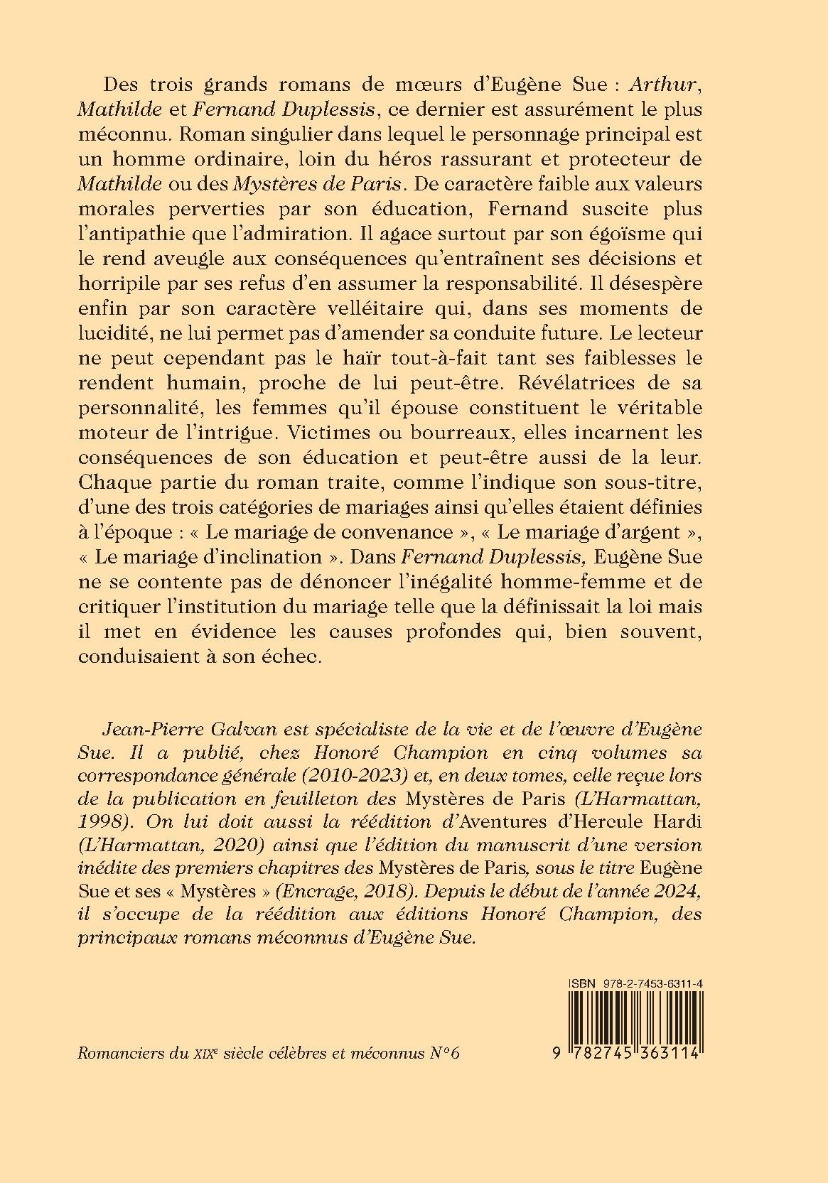 Des trois grands romans de mœurs d’Eugène Sue : Arthur, Mathilde et Fernand Duplessis, ce dernier est assurément le plus méconnu. Roman singulier dans lequel le personnage principal est un homme ordinaire, loin du héros rassurant et protecteur de Mathilde ou des Mystères de Paris. De caractère faible aux valeurs morales perverties par son éducation, Fernand suscite plus l’antipathie que l’admiration. Il agace surtout par son égoïsme qui le rend aveugle aux conséquences qu’entraînent ses décisions et horripile par ses refus d’en assumer la responsabilité. Il désespère enfin par son caractère velléitaire qui, dans ses moments de lucidité, ne lui permet pas d’amender sa conduite future. Le lecteur ne peut cependant pas le haïr tout-à-fait tant ses faiblesses le rendent humain, proche de lui peut-être. Révélatrices de sa personnalité, les femmes qu’il épouse constituent le véritable moteur de l’intrigue. Victimes ou bourreaux, elles incarnent les conséquences de son éducation et peut-être aussi de la leur. Chaque partie du roman traite, comme l’indique son sous-titre, d’une des trois catégories de mariages ainsi qu’elles étaient définies à l’époque : « Le mariage de convenance », « Le mariage d’argent », « Le mariage d’inclination ». Dans Fernand Duplessis, Eugène Sue ne se contente pas de dénoncer l’inégalité homme-femme et de critiquer l’institution du mariage telle que la définissait la loi mais il met en évidence les causes profondes qui, bien souvent, conduisaient à son échec.