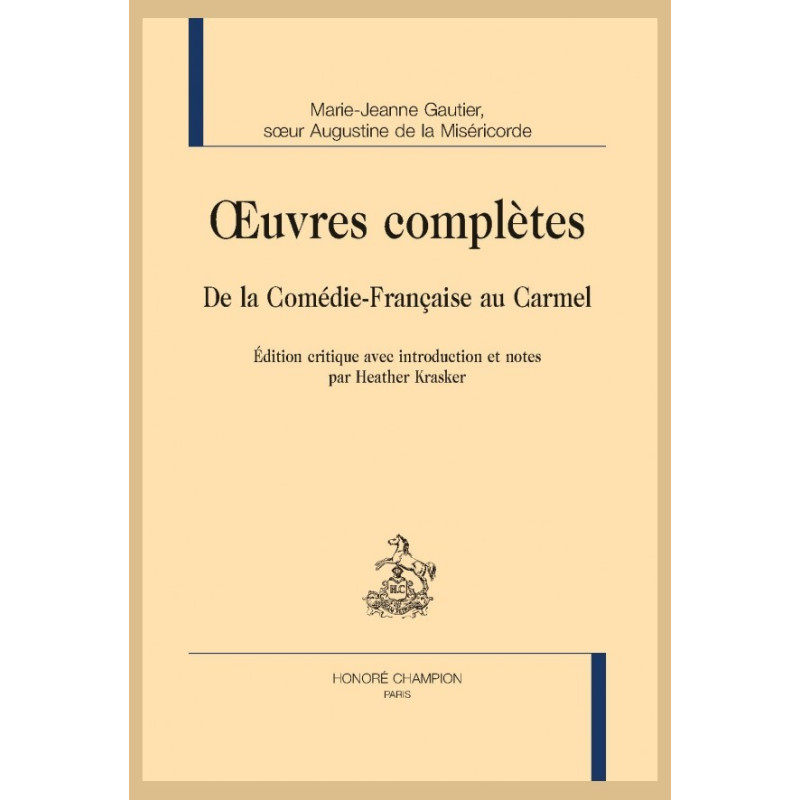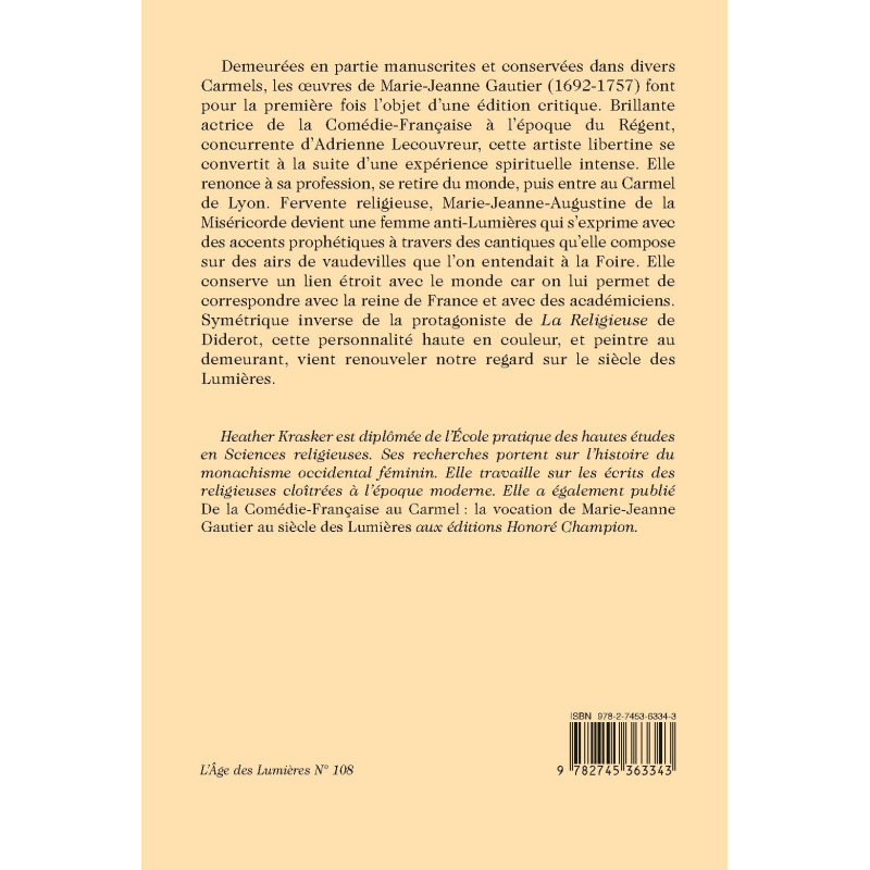 Demeurées en partie manuscrites et conservées dans divers Carmels, les œuvres de Marie-Jeanne Gautier (1692-1757) font pour la première fois l’objet d’une édition critique. Brillante actrice de la Comédie-Française à l’époque du Régent, concurrente d’Adrienne Lecouvreur, cette artiste libertine se convertit à la suite d’une expérience spirituelle intense. Elle renonce à sa profession, se retire du monde, puis entre au Carmel de Lyon. Fervente religieuse, Marie-Jeanne-Augustine de la Miséricorde devient une femme anti-Lumières qui s’exprime avec des accents prophétiques à travers des cantiques qu’elle compose sur des airs de vaudevilles que l’on entendait à la Foire. Elle conserve un lien étroit avec le monde car on lui permet de correspondre avec la reine de France et avec des académiciens. Symétrique inverse de la protagoniste de La Religieuse de Diderot, cette personnalité haute en couleur, et peintre au demeurant, vient renouveler notre regard sur le siècle des Lumières.