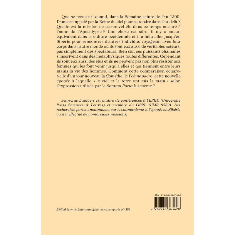 Que se passe-t-il quand, dans la Semaine sainte de l’an 1300, Dante est appelé par la Reine du ciel pour se rendre dans l’au-delà ? Quelle est la mission de ce nouvel élu dans ce temps mesuré à l’aune de l’Apocalypse ? Une chose est sûre, il n’y a aucun équivalent dans la culture occidentale et il a fallu aller jusqu’en Sibérie pour rencontrer d’autres individus voyageant avec leur corps dans l’autre monde où ils sont eux aussi de véritables acteurs, pas simplement des spectateurs. Bien sûr, ces puissants chamanes s’inscrivent dans des métaphysiques toutes différentes. Cependant ils sont eux aussi des élus et ils ne peuvent pas non plus résister aux femmes qui les font venir jusqu’à elles et qui tiennent entre leurs mains la vie des hommes. Comment cette comparaison éclaire-t- elle d’un jour nouveau la Comédie, le Poème sacré, cette nouvelle épopée à laquelle « le ciel et la terre ont mis la main » selon l’expression utilisée par le Sommo Pœta lui-même ?