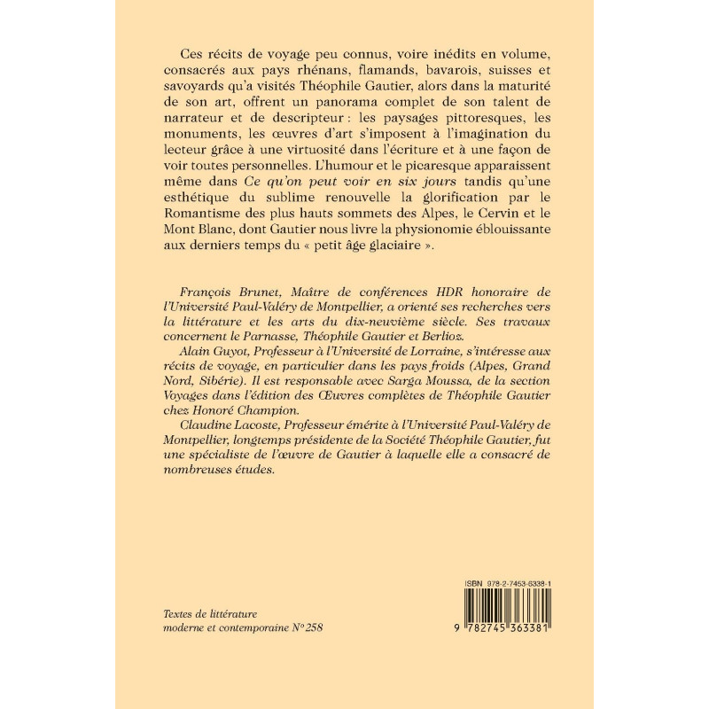 Ces récits de voyage peu connus, voire inédits en volume, consacrés aux pays rhénans, flamands, bavarois, suisses et savoyards qu’a visités Théophile Gautier, alors dans la maturité de son art, offrent un panorama complet de son talent de narrateur et de descripteur : les paysages pittoresques, les monuments, les œuvres d’art s’imposent à l’imagination du lecteur grâce à une virtuosité dans l’écriture et à une façon de voir toutes personnelles. L’humour et le picaresque apparaissent même dans Ce qu’on peut voir en six jours tandis qu’une esthétique du sublime renouvelle la glorification par le Romantisme des plus hauts sommets des Alpes, le Cervin et le Mont Blanc, dont Gautier nous livre la physionomie éblouissante aux derniers temps du « petit âge glaciaire ».