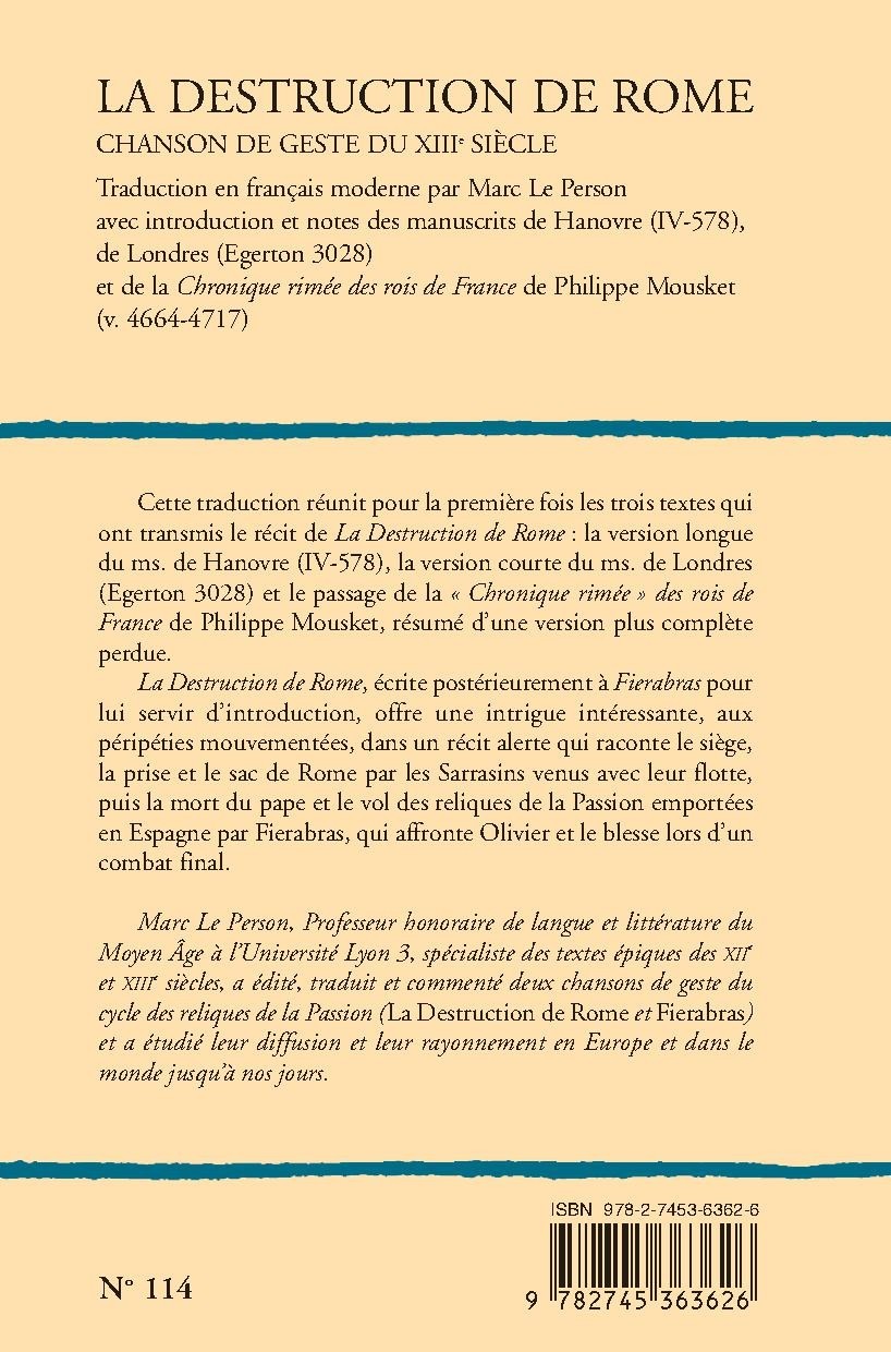 Marc Le Person, Professeur honoraire de langue et littérature du Moyen Âge à l’Université Lyon 3, spécialiste des textes épiques des XIIe et XIIIe siècles, a édité, traduit et commenté deux chansons de geste du cycle des reliques de la Passion (La Destruction de Rome et Fierabras) et a étudié leur diffusion et leur rayonnement en Europe et dans le monde jusqu’à nos jours.