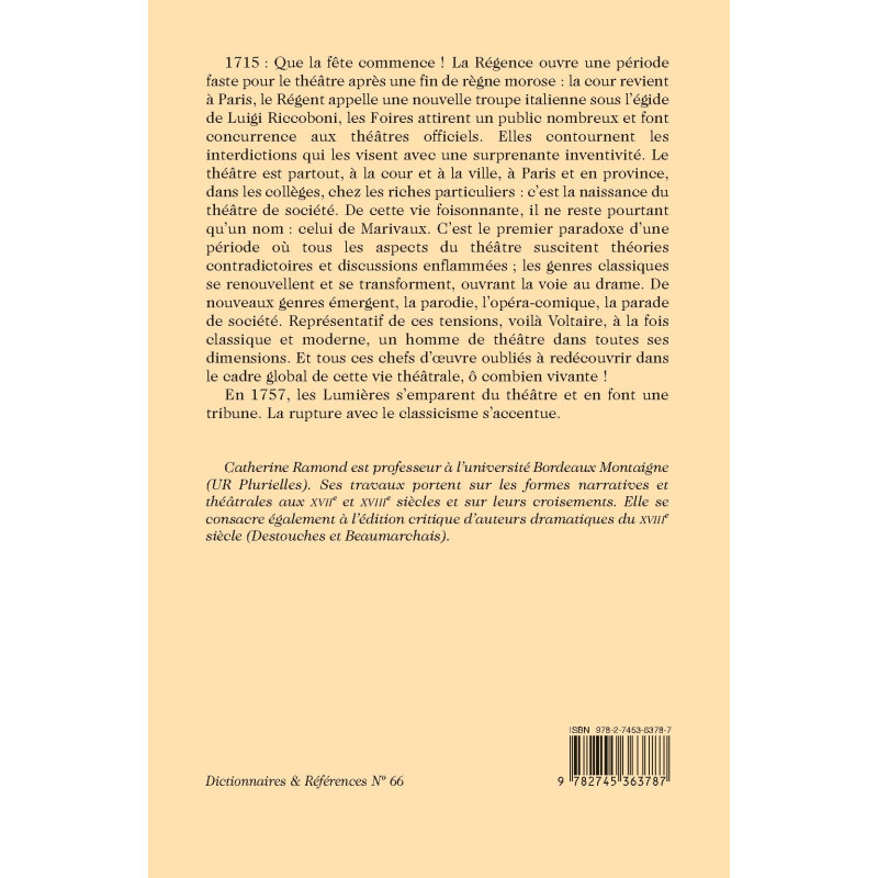 1715 : Que la fête commence ! La Régence ouvre une période faste pour le théâtre après une fin de règne morose : la cour revient à Paris, le Régent appelle une nouvelle troupe italienne sous l’égide de Luigi Riccoboni, les Foires attirent un public nombreux et font concurrence aux théâtres officiels. Elles contournent les interdictions qui les visent avec une surprenante inventivité. Le théâtre est partout, à la cour et à la ville, à Paris et en province, dans les collèges, chez les riches particuliers : c’est la naissance du théâtre de société. De cette vie foisonnante, il ne reste pourtant qu’un nom : celui de Marivaux. C’est le premier paradoxe d’une période où tous les aspects du théâtre suscitent théories contradictoires et discussions enflammées ; les genres classiques se renouvellent et se transforment, ouvrant la voie au drame. De nouveaux genres émergent, la parodie, l’opéra-comique, la parade de société. Représentatif de ces tensions, voilà Voltaire, à la fois classique et moderne, un homme de théâtre dans toutes ses dimensions. Et tous ces chefs d’œuvre oubliés à redécouvrir dans le cadre global de cette vie théâtrale, ô combien vivante !