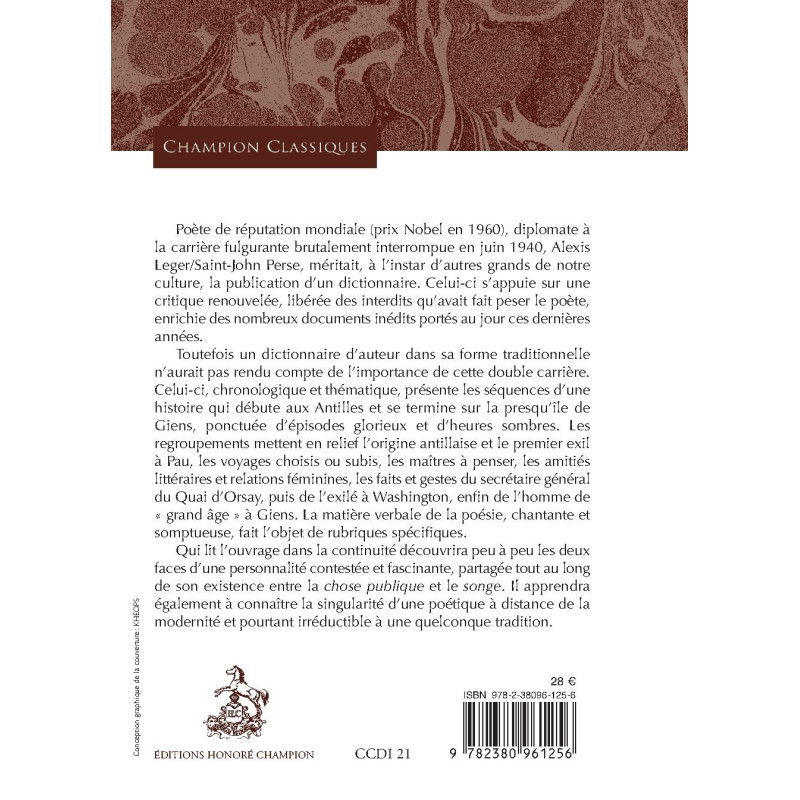 Poète de réputation mondiale (prix Nobel en 1960), diplomate à la carrière fulgurante brutalement interrompue en juin 1940, Alexis Leger/Saint-John Perse, méritait, à l’instar d’autres grands de notre culture, la publication d’un dictionnaire. Celui-ci s’appuie sur une critique renouvelée, libérée des interdits qu’avait fait peser le poète, enrichie des nombreux documents inédits portés au jour ces dernières années.