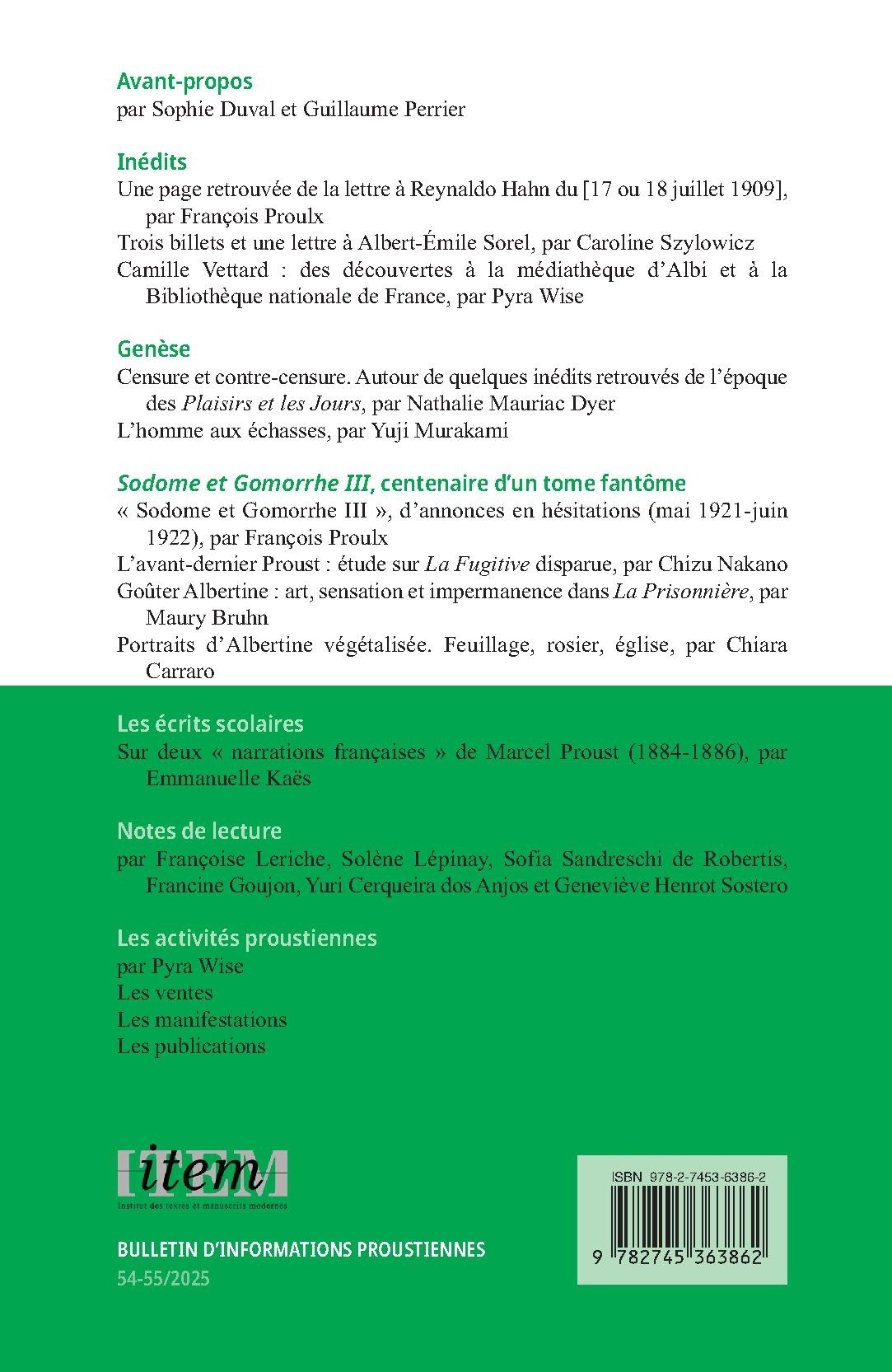 Le Bulletin d'informations proustiennes (BIP), revue placée sous la direction de Sophie Duval et Guillaume Perrier et désormais publiée aux éditions Honoré Champion, fait le point chaque année sur le travail entrepris par l’équipe Proust de l’Institut des textes et manuscrits modernes (CNRS/ENS) dans les domaines de la genèse, de l’édition et de l’interprétation de l’œuvre de Marcel Proust. La revue présente aussi régulièrement des inédits. La dernière partie du Bulletin d'informations proustiennes est consacrée aux « Notes de lecture » et à la chronique détaillée des « Ventes », « Manifestations » et « Publications » proustiennes.
