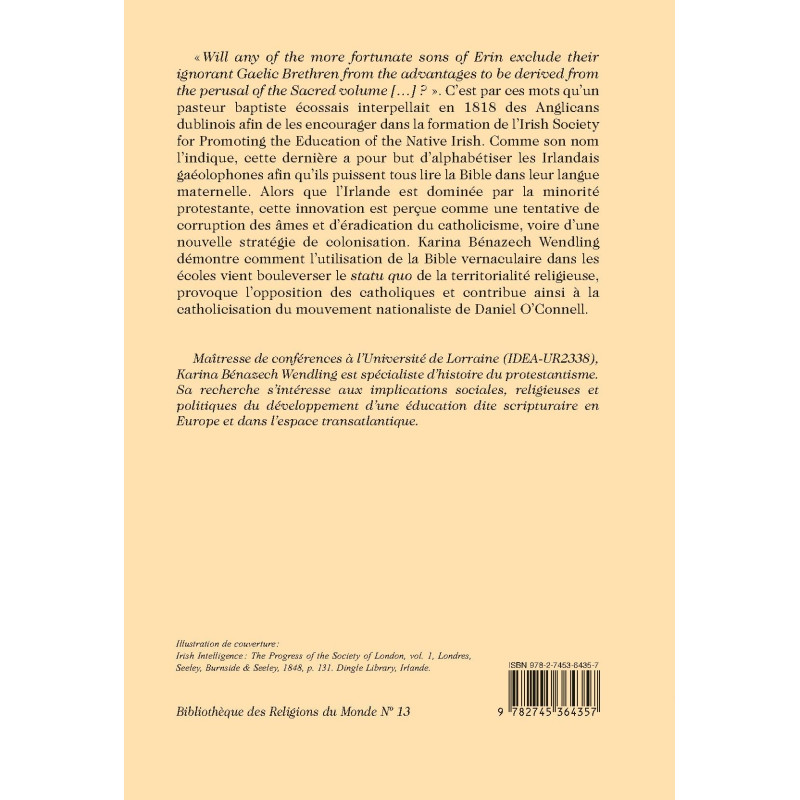 «Will any of the more fortunate sons of Erin exclude their ignorant Gaelic Brethren from the advantages to be derived from the perusal of the Sacred volume […] ? ». C’est par ces mots qu’un pasteur baptiste écossais interpellait en 1818 des Anglicans dublinois afin de les encourager dans la formation de l’Irish Society for Promoting the Education of the Native Irish. Comme son nom l’indique, cette dernière a pour but d’alphabétiser les Irlandais gaéolophones afin qu’ils puissent tous lire la Bible dans leur langue maternelle. Alors que l’Irlande est dominée par la minorité protestante, cette innovation est perçue comme une tentative de corruption des âmes et d’éradication du catholicisme, voire d’une nouvelle stratégie de colonisation. Karina Bénazech Wendling démontre comment l’utilisation de la Bible vernaculaire dans les écoles vient bouleverser le statu quo de la territorialité religieuse, provoque l’opposition des catholiques et contribue ainsi à la catholicisation du mouvement nationaliste de Daniel O’Connell.