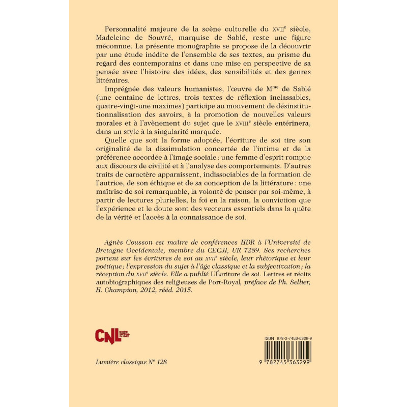 Agnès Cousson est maître de conférences HDR à l’Université de Bretagne Occidentale, membre du CECJI, UR 7289. Ses recherches portent sur les écritures de soi au XVIIe siècle, leur rhétorique et leur poétique ; l’expression du sujet à l’âge classique et la subjectivation ; la réception du XVIIe siècle. Elle a publié L’Écriture de soi. Lettres et récits autobiographiques des religieuses de Port-Royal, préface de Ph. Sellier, H. Champion, 2012, rééd. 2015.