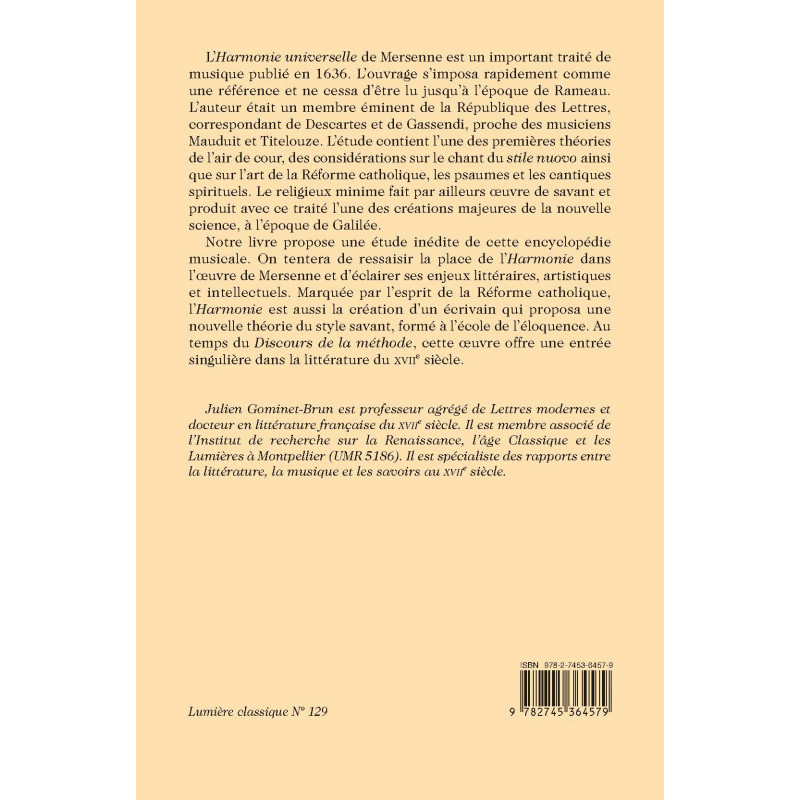 L’Harmonie universelle de Mersenne est un important traité de musique publié en 1636. L’ouvrage s’imposa rapidement comme une référence et ne cessa d’être lu jusqu’à l’époque de Rameau. L’auteur était un membre éminent de la République des Lettres, correspondant de Descartes et de Gassendi, proche des musiciens Mauduit et Titelouze. L’étude contient l’une des premières théories de l’air de cour, des considérations sur le chant du stile nuovo ainsi que sur l’art de la Réforme catholique, les psaumes et les cantiques spirituels. Le religieux minime fait par ailleurs œuvre de savant et produit avec ce traité l’une des créations majeures de la nouvelle science, à l’époque de Galilée.