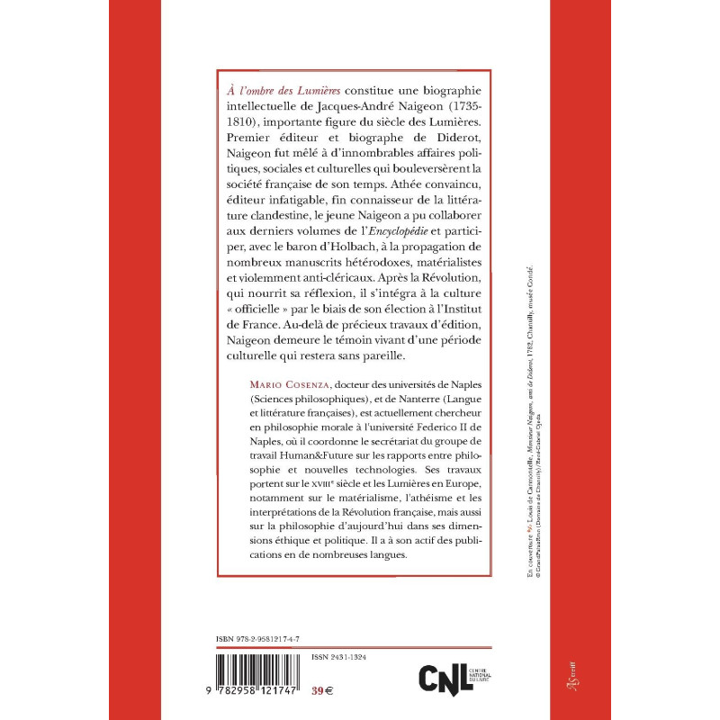 À l’ombre des Lumières constitue une biographie intellectuelle de Jacques- André Naigeon (1735-1810), importante figure du siècle des Lumières. Premier éditeur et biographe de Diderot, Naigeon fut mêlé à d’innombrables affaires politiques, sociales et culturelles qui bouleversèrent la société française de son temps. Athée convaincu, éditeur infatigable, fin connaisseur de la littérature clandestine, le jeune Naigeon a pu collaborer aux derniers volumes de l’Encyclopédie et participer, avec le baron d’Holbach, à la propagation de nombreux manuscrits hétérodoxes, matérialistes et violemment anti-cléricaux. Après la Révolution, qui nourrit sa réflexion, il s’intégra à la culture « officielle » par le biais de son élection à l’Institut de France. Au-delà de précieux travaux d’édition, Naigeon demeure le témoin vivant d’une période culturelle qui restera sans pareille.