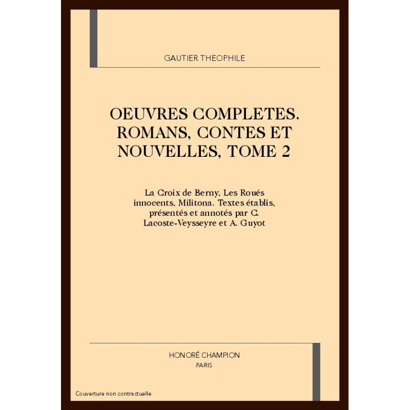 Ce volume prouve la richesse et la variété de l'œuvre romanesque de Théophile Gautier. La Croix de Berny, roman steeple chease (1845) est une entreprise originale: c'est un roman épistolaire où quatre auteurs différents (Delphine de Girardin, Joseph Méry, Jules Sandeau et Théophile Gautier) assument chacun un personnage; trois hommes amoureux de la même femme poursuivent le bonheur à travers une intrigue très habilement, mais inéluctablement, conduite, dans une quête de l'absolu qui permet aux auteurs d'éviter les écueils de la banalité et de la sentimentalité, toujours affleurants dans une œuvre destinée au grand public; une forme d'ironie grinçante, bien dans le goût des Romantiques, donne à l'œuvre un ton très original. Les Roués innocents (1846) sont un "roman sentimental" qui utilise tous les stéréotypes et les procédés de ce genre, que Gautier lui-même condamnait. Pourquoi alors ce roman? Par goût du pastiche, technique que Gautier a toujours affectionnée: battre l'ennemi avec ses propre armes est bien dans la manière de cet ironiste impénitent, cherchant la difficulté et pratiquant avec délices le second degré. L'originalité de l'œuvre naît d'un savant mélange de science et de désinvolture. Militona (1847) transporte le lecteur en Espagne. Le roman, profondément inspiré par les voyages de Gautier, réunit tous les caractères du roman populaire, mâtinés de mélodrame et de vaudeville, mais Gautier s'y amuse autant que le public, qui lui accorda largement ses suffrages. A travers la diversité de ces œuvres se dessinent les lignes fondamentales du microcosme de Gautier, le rôle primordial de la femme et de l'amour dans la quête de l'absolu, qui requiert, de la part de l'homme, engagement sans restriction et don total de soi.