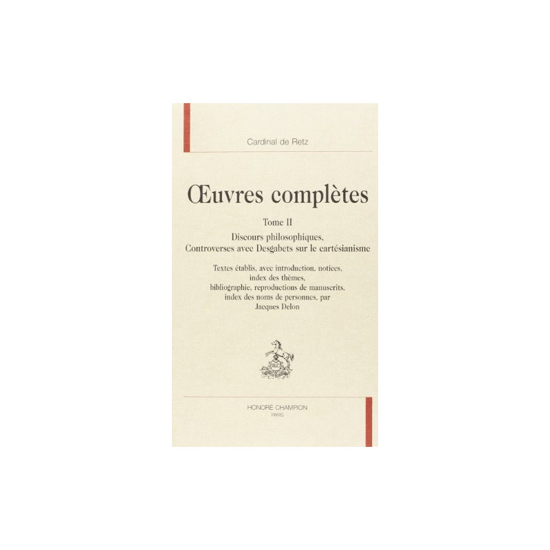 Bel exemple de disputes philosophiques au XVIIe siècle, les Controverses avec Desgabets sur le cartésianisme constituent dans l'œuvre de Retz un ensemble à part, original et inattendu, notamment par rapport aux Mémoires rédigés à la même époque. Elles n'ont jamais été publiées jusqu'à présent dans leur intégralité. Victor Cousin n'avait pas réussi à retrouver leur enchaînement initial. Ayant pu bénéficier des travaux de G. Rodis Lewis sur Desgabets, ce deuxième tome des Œuvres complètes de Retz restitue le déroulement de l'ensemble des Controverses de Commercy et rend plus accessible leur contenu. La justesse de l'argumentation philosophique et la hauteur de vue dont fait preuve ici le Cardinal, contribuent singulièrement à corriger l'impression de légèreté laissée par l'action du Frondeur et la lecture de certaines pages de ses Mémoires.