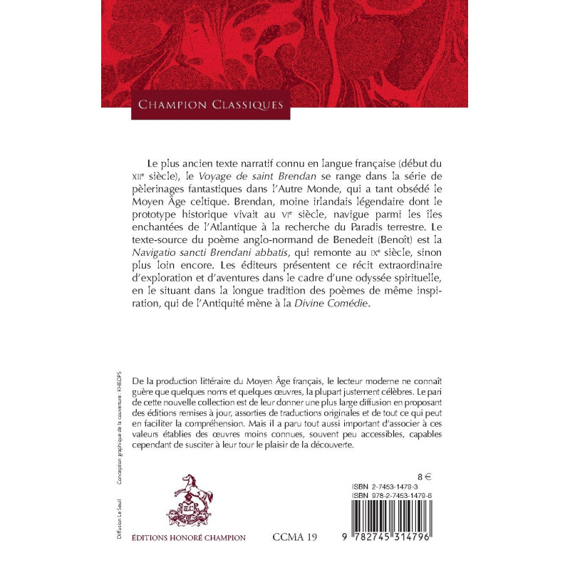 Le plus ancien texte narratif connu en langue française (début du XIIe siècle), le Voyage de saint Brendan se range dans la série de pèlerinages fantastiques dans l`Autre Monde, qui a tant obsédé le Moyen Âge celtique. Brendan, moine irlandais légendaire dont le prototype historique vivait au VIe siècle, navigue parmi les îles enchantées de l`Atlantique à la recherche du Paradis terrestre. Le texte-source du poème anglo-normand de Benedeit (Benoît) est la Navigatio sancti Brendani abbatis, qui remonte au IXe siècle, sinon plus loin encore. Les éditeurs présentent ce récit extraordinaire d`exploration et d`aventures dans le cadre d`une odyssée spirituelle, en le situant dans la longue tradition des poèmes de même inspiration, qui de l`Antiquité mène à la Divine Comédie.