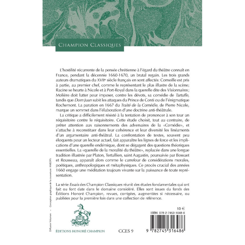 L'hostilité récurrente de la pensée chrétienne à l'égard du théâtre connaît en France, pendant la décennie 1660-1670, un brutal regain. Les trois grands auteurs dramatiques du XVIIe siècle français en sont affectés: Corneille est pris à partie, au premier chef, comme le représentant le plus illustre de la scène; Racine se heurte à Nicole et à Port-Royal dans la querelle dite des Visionnaires ; Molière doit lutter pour imposer, contre les dévots, sa comédie de Tartuffe, tandis que Dom Juan subit les attaques du Prince de Conti ou de l'énigmatique Rochemont. La parution en 1667 du Traité de la Comédie, de Pierre Nicole, marque un sommet dans l'élaboration d'une doctrine anti-théâtrale. La critique a difficilement résisté à la tentation de prononcer à son tour un réquisitoire contre le réquisitoire. Cette étude choisit, tout au contraire, de prêter attention aux raisonnements des adversaires de la "Comédie", et s'attache à reconstituer dans leur cohérence et leur diversité les linéaments d'un argumentaire anti-théâtral. La confrontation de textes, souvent peu éloquents pour un lecteur actuel, fait apparaître les lignes de force et les implications d'une querelle endémique, dont se dégagent des questions théoriques essentielles. La "querelle de la moralité du théâtre", replacée dans une longue tradition illustrée par Platon, Tertullien, saint Augustin, poursuivie par Bossuet et Rousseau, apparaît alors comme le carrefour de considérations morales, poétiques, anthropologiques et métaphysiques. Ce procès crucial des années 1660 engage une méditation toujours vivante sur la puissance de toute représentation.