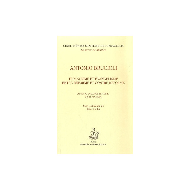 De Florence à Venise, en passant par la France et par l'Allemagne, le parcours d'Antonio Brucioli (1487 1566) s'inscrit dans cette période riche et complexe située entre Réforme et Contre Réforme. À partir d'une formation humaniste qui se teinte fortement d'anticléricalisme, ses préoccupations religieuses se développent au contact des idées évangéliques et réformées. Son intense activité éditoriale et typographique reflète cet ensemble d'intérêts et témoigne de l'importance de son rôle dans la vulgarisation d'une culture profane et religieuse. La récurrence de son nom dans les études les plus récentes concernant aussi bien l'histoire du livre et de l'édition que l'histoire religieuse de l'Italie du XVIe siècle a fondé l'idée de lui consacrer un colloque, qui s'est tenu à Tours au Centre d'Études supérieures de la Renaissance en mai 2005. Ainsi, la manifestation a permis de mieux cerner, à travers la diversité de ses activités, cette personnalité significative, à la fois particulière et représentative, du panorama culturel de la Renaissance italienne.