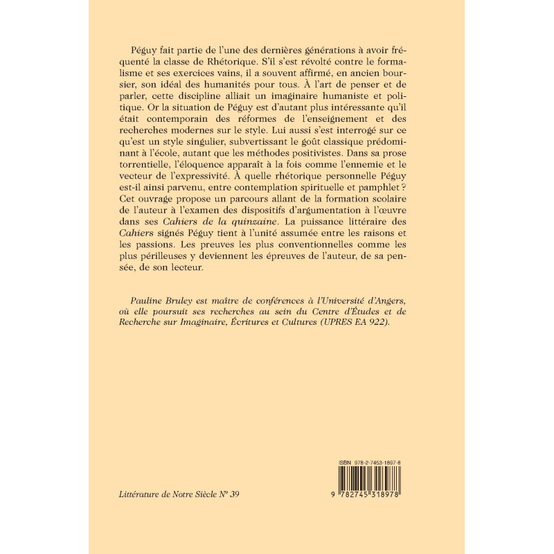 Péguy fait partie de l'une des dernières générations à avoir fréquenté la classe de Rhétorique. S'il s'est révolté contre le formalisme et ses exercices vains, il a souvent affirmé, en ancien boursier, son idéal des humanités pour tous. À l'art de penser et de parler, cette discipline alliait un imaginaire humaniste et politique. Or la situation de Péguy est d'autant plus intéressante qu'il était contemporain des réformes de l'enseignement et des recherches modernes sur le style. Lui aussi s'est interrogé sur ce qu'est un style singulier, subvertissant le goût classique prédominant à l'école, autant que les méthodes positivistes. Dans sa prose torrentielle, l'éloquence apparaît à la fois comme l'ennemie et le vecteur de l'expressivité. À quelle rhétorique personnelle Péguy est-il ainsi parvenu, entre contemplation spirituelle et pamphlet ? Cet ouvrage propose un parcours allant de la formation scolaire de l'auteur à l'examen des dispositifs d'argumentation à l'œuvre dans ses Cahiers de la quinzaine. La puissance littéraire des Cahiers signés Péguy tient à l'unité assumée entre les raisons et les passions. Les preuves les plus conventionnelles comme les plus périlleuses y deviennent les épreuves de l'auteur, de sa pensée, de son lecteur.