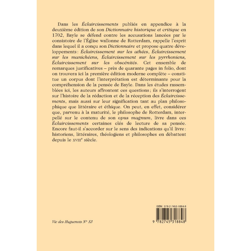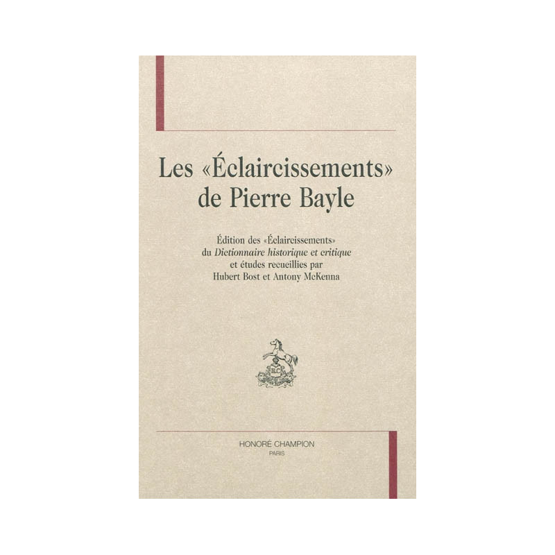 Dans les Éclaircissements publiés en appendice à la deuxième édition de son Dictionnaire historique et critique en 1702, Bayle se défend contre les accusations lancées par le consistoire de l'Église wallonne de Rotterdam, rappelle l'esprit dans lequel il a conçu son Dictionnaire et propose quatre développements : Éclaircissement sur les athées, Éclaircissement sur les manichéens, Éclaircissement sur les pyrrhoniens, Éclaircissement sur les obscénités. Cet ensemble de remarques justificatives - près de quarante pages in folio, dont on trouvera ici la première édition moderne complète - constitue un corpus dont l'interprétation est déterminante pour la compréhension de la pensée de Bayle.