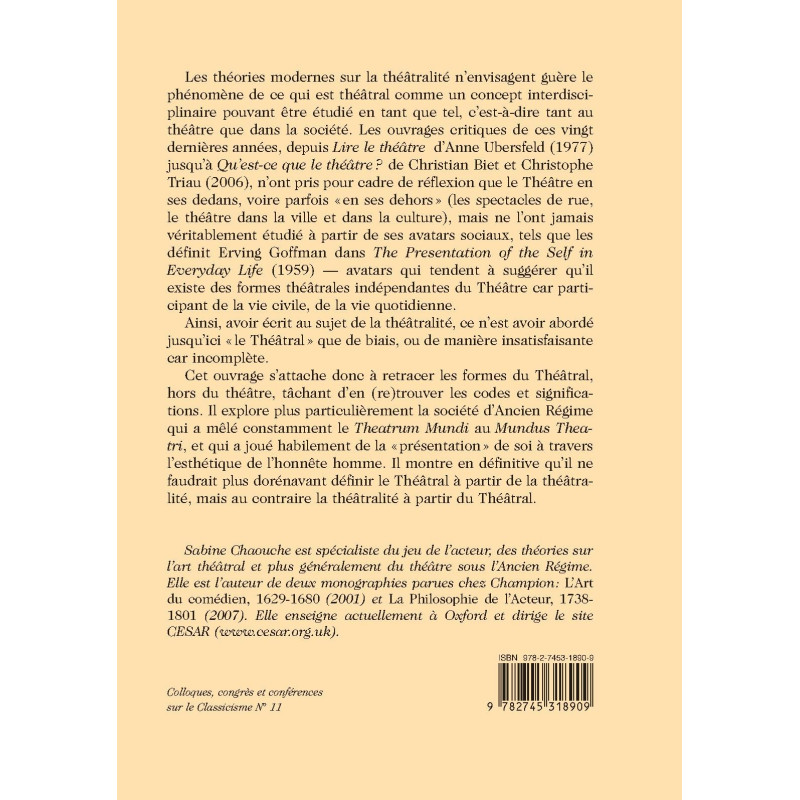 Les théories modernes sur la théâtralité n`envisagent guère le phénomène de ce qui est théâtral, comme un concept interdisciplinaire, pouvant être étudié en tant que tel, c`est-à -dire tant au théâtre que dans la société. Les ouvrages critiques de ces vingt dernières années, depuis Lire le théâtre d`Anne Ubersfeld (1977) jusqu`à Qu`est-ce que le théâtre ? de Christian Biet et Christophe Triau (2006), n`ont pris pour cadre de réflexion que le Théâtre en ses dedans, voire parfois "en ses dehors" (les spectacles de rue, le théâtre dans la ville et dans la culture), mais ne l`ont jamais véritablement étudié à partir de ses avatars sociaux, tels que les définit Erving Goffman dans The Presentation of the Self in Everyday Life (1959) - avatars qui tendent à suggérer qu`il existe des formes théâtrales indépendantes du Théâtre car participant de la vie civile, de la vie quotidienne. Cet ouvrage s`attache donc à retracer les formes de ce Théâtral, hors du théâtre, tâchant d`en (re)trouver les codes et significations. Il explore plus particulièrement la société d`Ancien Régime qui a mêlé constamment le Theatrum Mundi au Mundus Theatri, et qui a joué habilement de la "présentation" de soi à travers l`esthétique de l`honnête homme. Il montre en définitive qu`il ne faudrait plus dorénavant définir le Théâtral à partir de la théâtralité, mais au contraire la théâtralité à partir du Théâtral.