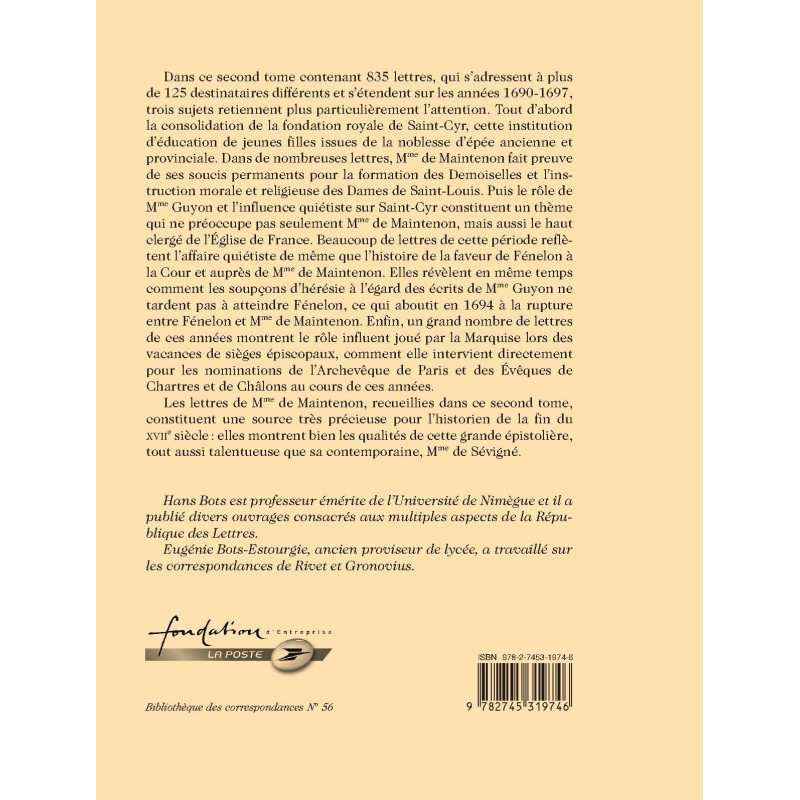 Le second tome de la nouvelle édition intégrale et critique de la correspondance de Mme de Maintenon contient 828 lettres, qui s’adressent à plus de 125 destinataires différents et s’étendent sur les années 1690-1697. Trois sujets y retiennent plus particulièrement l’attention : tout d’abord la consolidation de la fondation royale de Saint-Cyr, puis l’influence quiétiste sur Saint-Cyr et l’histoire de la faveur de Fénelon à la Cour et auprès de Mme de Maintenon, jusqu’à la rupture en 1694. Les lettres montrent bien comment les soupçons d’hérésie à l’égard des écrits de Mme Guyon ne tardent pas à atteindre Fénelon. Enfin cette correspondance témoigne du rôle influent joué par la Marquise lors des vacances de sièges épiscopaux. Les lettres de Mme de Maintenon, recueillies dans ce second tome, constituent une source très précieuse pour l’historien de la fin du XVIIe siècle : elles montrent bien les qualités de cette grande épistolière, tout aussi talentueuse que sa contemporaine, Mme de Sévigné.