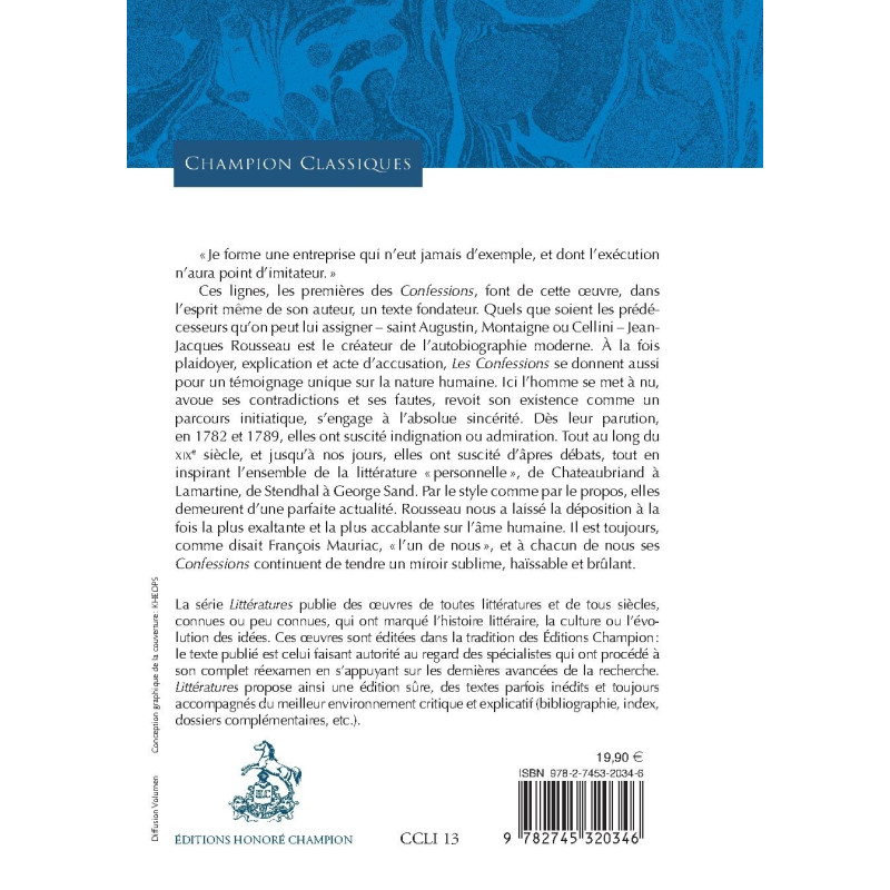 "Je forme une entreprise qui n'eut jamais d'exemple, et dont l'exécution n'aura point d'imitateur." Ces lignes, les premières des Confessions, font de cette œuvre, dans l'esprit même de son auteur, un texte fondateur. Quels que soient les prédécesseurs qu'on peut lui assigner - saint Augustin, Montaigne ou Cellini - Jean-Jacques Rousseau est le créateur de l'autobiographie moderne. À la fois plaidoyer, explication et acte d'accusation, Les Confessions se donnent aussi pour un témoignage unique sur la nature humaine. Ici l'homme se met à nu, avoue ses contradictions et ses fautes, revoit son existence comme un parcours initiatique, s'engage à l'absolue sincérité. Dès leur parution, en 1782 et 1789, elles ont suscité indignation ou admiration. Tout au long du XIXe siècle, et jusqu'à nos jours, elles ont suscité d'âpres débats, tout en inspirant l'ensemble de la littérature "personnelle", de Chateaubriand à Lamartine, de Stendhal à George Sand. Par le style comme par le propos, elles demeurent d'une parfaite actualité. Rousseau nous a laissé la déposition à la fois la plus exaltante et la plus accablante sur l'âme humaine. Il est toujours, comme disait François Mauriac, "l'un de nous", et à chacun de nous ses Confessions continuent de tendre un miroir sublime, haïssable et brûlant.