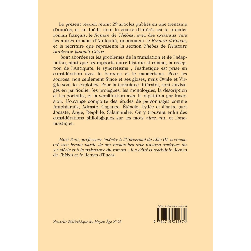 Le présent recueil réunit 29 articles publiés en une trentaine d'années, et un inédit dont le centre d'intérêt est le premier roman français, le Roman de Thèbes, avec des excursus vers les autres romans d'Antiquité, notamment le Roman d'Eneas, et la récriture que représente la section Thèbes de l'Histoire Ancienne jusqu'à César. Sont abordés ici les problèmes de la translation et de l'adaptation, ainsi que les rapports entre histoire et roman, la réception de l'Antiquité, le syncrétisme ; l'esthétique est prise en considération avec le baroque et le maniérisme. Pour les sources, non seulement Stace et ses gloses, mais Ovide et Virgile sont ici exploités. Pour la technique littéraire, sont envisagés en particulier les prologues, les monologues, la description et les portraits, et la versification avec la répétition par inversion. L'ouvrage comporte des études de personnages comme Amphiaraüs, Adraste, Capanée, Étéocle, Tydée et d'autre part Jocaste, Argie, Déiphile, Salamandre. On y trouvera enfin des considérations philologiques sur les mots vitre, nu, et l'onomastique. Aimé Petit, professeur émérite à l'Université de Lille III, a consacré une bonne partie de ses recherches aux romans antiques du XIIe siècle et à la naissance du roman ; il a édité et traduit le Roman de Thèbes et le Roman d'Eneas.