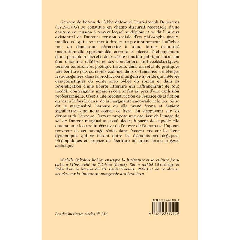 L'œuvre de fiction de l'abbé défroqué Henri-Joseph Dulaurens (1719-1793) se constitue en champ discursif réceptacle d'une écriture en tension à travers lequel se déploie et se dit l'univers existentiel de l'auteur : tension sociale d'un philosophe gueux, intellectuel qui a son mot à dire et un positionnement à afficher tout en demeurant réfractaire à toute forme d'autorité institutionnelle appréhendée comme la pierre d'achoppement d'une possible recherche de la vérité ; tension politique entre son état d'homme d'Église et ses convictions anti-ecclésiastiques ; tension culturelle et poétique inscrite dans un refus de pratiquer une écriture plus ou moins codifiée, dans sa tendance à mélanger les sous-genres, dans la production d'un genre hybride qui mêle les caractéristiques du conte avec celles du roman et dans sa revendication d'une liberté littéraire qui l'affranchirait de tout modèle contraignant même si cela se fait au prix d'une exclusion professionnelle. C'est à une reconstruction de l'espace de la fiction qui est à la fois la cause de la marginalité auctoriale et le lieu où se dit la marginalité, l'espace où elle prend forme et devient significative que nous convie ce livre. En s'appuyant sur les discours de l'époque, l'auteur propose une esquisse de l'image de soi de l'auteur marginal au XVIIIe siècle, à partir de laquelle elle entame une lecture intégrative de l'œuvre de Dulaurens. L'apport novateur de cet ouvrage réside dans l'accent mis sur les liens dynamiques qui se tissent entre les éléments sociologiques, biographiques et l'espace de l'écriture où prend forme le geste artistique.