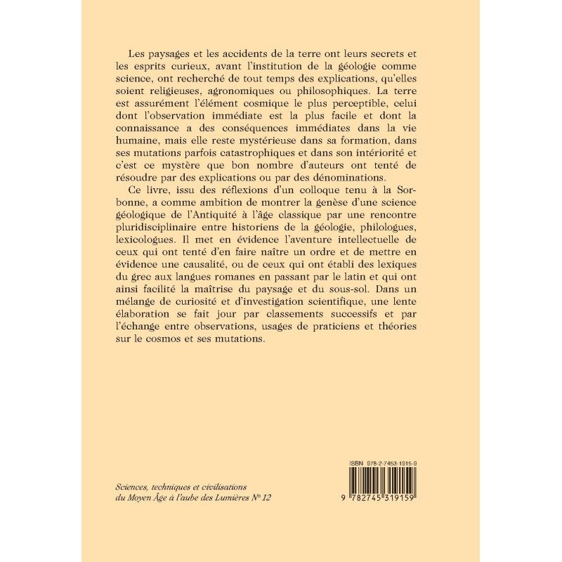 Les paysages et les accidents de la terre ont leurs secrets et les esprits curieux, avant l'institution de la géologie comme science, ont recherché de tout temps des explications, qu'elles soient religieuses, agronomiques ou philosophiques. La terre est assurément l'élément cosmique le plus perceptible, celui dont l'observation immédiate est la plus facile et dont la connaissance a des conséquences immédiates dans la vie humaine, mais elle reste mystérieuse dans sa formation, dans ses mutations parfois catastrophiques et dans son intériorité et c'est ce mystère que bon nombre d'auteurs ont tenté de résoudre par des explications ou par des dénominations. Ce livre, issu des réflexions d'un colloque tenu à la Sorbonne, a comme ambition de montrer la genèse d'une science géologique de l'Antiquité à l'âge classique par une rencontre pluridisciplinaire entre historiens de la géologie, philologues, lexicologues. Il met en évidence l'aventure intellectuelle de ceux qui ont tenté d'en faire naître un ordre et de mettre en évidence une causalité, ou de ceux qui ont établi des lexiques du grec aux langues romanes en passant par le latin et qui ont ainsi facilité la maîtrise du paysage et du sous-sol. Dans un mélange de curiosité et d'investigation scientifique, une lente élaboration se fait jour par classements successifs et par l'échange entre observations, usages de praticiens et théories sur le cosmos et ses mutations.