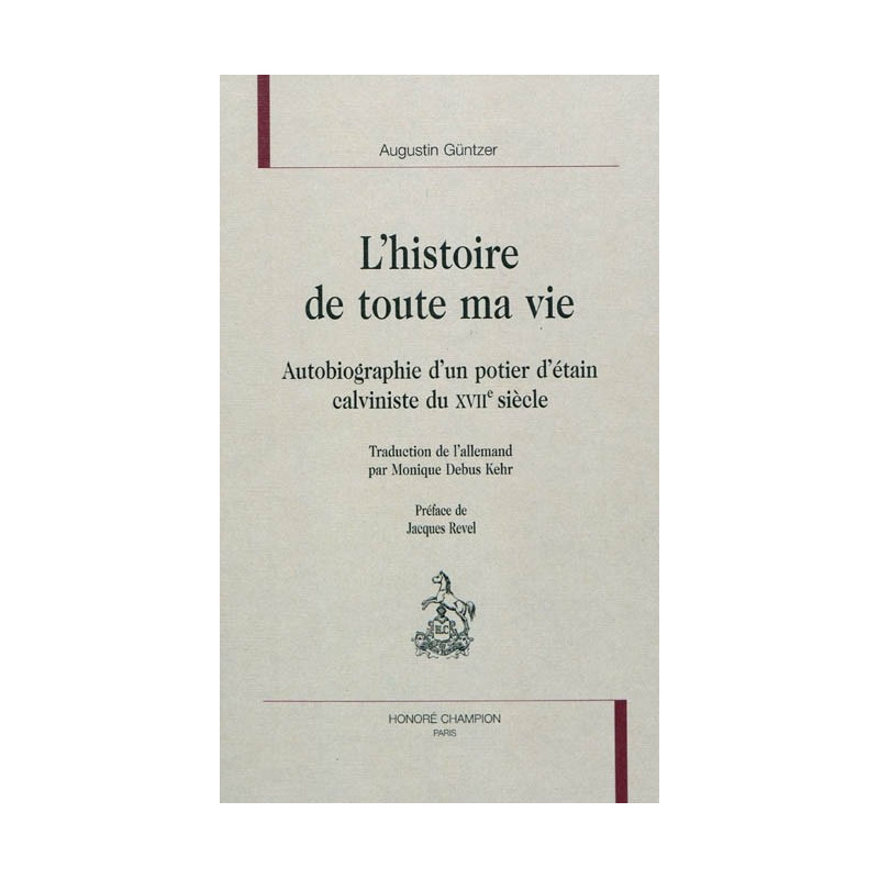Né à Obernai (Alsace), en 1596, dans une famille d`artisans aisée et en vue, Augustin Güntzer est éduqué dans la confession calviniste. À 19 ans, après un apprentissage chez son père, potier d`étain, il entreprend à pied un premier voyage de compagnon. Pendant quatre ans, il parcourt l`Allemagne et l`Italie, poussant jusqu`à Sienne et Rome où il découvre les mœurs des "papistes ". Un second voyage d`un an et demi le conduit en Lettonie, au Danemark, en Angleterre et en France. Ces pérégrinations l`exposent à la faim et au froid, aux bonnes et aux mauvaises rencontres. À son retour, refusant d`abjurer sa foi, il quitte Obernai, se fixe à Colmar où il épouse une veuve fortunée de l`élite protestante. Mais la guerre de Trente Ans fait rage, Colmar est pris par les impériaux, catholiques, et seul l`exil sauve les protestants de la conversion. Augustin Güntzer émigre alors à Strasbourg, où il se débat dans les difficultés matérielles, s`engage comme artilleur et voit mourir sa femme et son fils. Une fois Colmar repris par les armées protestantes, il s`y réinstalle, mais souffre du cantonnement des soldats dans sa maison, du manque de pain, des violences faites à ses filles et du mépris de ses congénères luthériens. À bout de forces, il se réfugie à Bâle, où il survit comme confiseur et marchand ambulant. Supplicié par des maux physiques qui se succèdent depuis l`enfance, il endure de surcroît l`effondrement de ses biens, de son statut social et de ses réseaux de parentèle pour n`avoir jamais renoncé à sa foi, ferment de son existence. Il écrit alors l`histoire de sa vie, où il rend compte à ses enfants de ces déclins et proclame son indéfectible croyance.