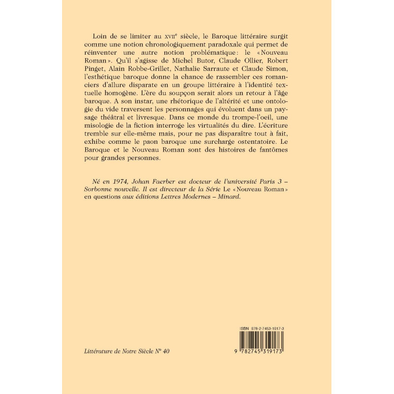 Loin de se limiter au XVIIe siècle, le Baroque littéraire surgit comme une notion chronologiquement paradoxale qui permet de réinventer une autre notion problématique: le "Nouveau Roman". Qu`il s`agisse de Michel Butor, Claude Ollier, Robert Pinget, Alain Robbe-Grillet, Nathalie Sarraute et Claude Simon, l`esthétique baroque donne la chance de rassembler ces romanciers d`allure disparate en un groupe littéraire à l`identité textuelle homogène. L`ère du soupçon serait alors un retour à l`âge baroque. A son instar, une rhétorique de l`altérité et une ontologie du vide traversent les personnages qui évoluent dans un paysage théâtral et livresque. Dans ce monde du trompe-l`œil, une misologie de la fiction interroge les virtualités du dire. L`écriture tremble sur elle-même mais, pour ne pas disparaître tout à fait, exhibe comme le paon baroque une surcharge ostentatoire. Le Baroque et le Nouveau Roman sont des histoires de fantômes pour grandes personnes. Né en 1974, Johan Faerber est docteur de l`université Paris 3 - Sorbonne nouvelle. Il est directeur de la Série Le "Nouveau Roman" en questions aux éditions Lettres Modernes - Minard.