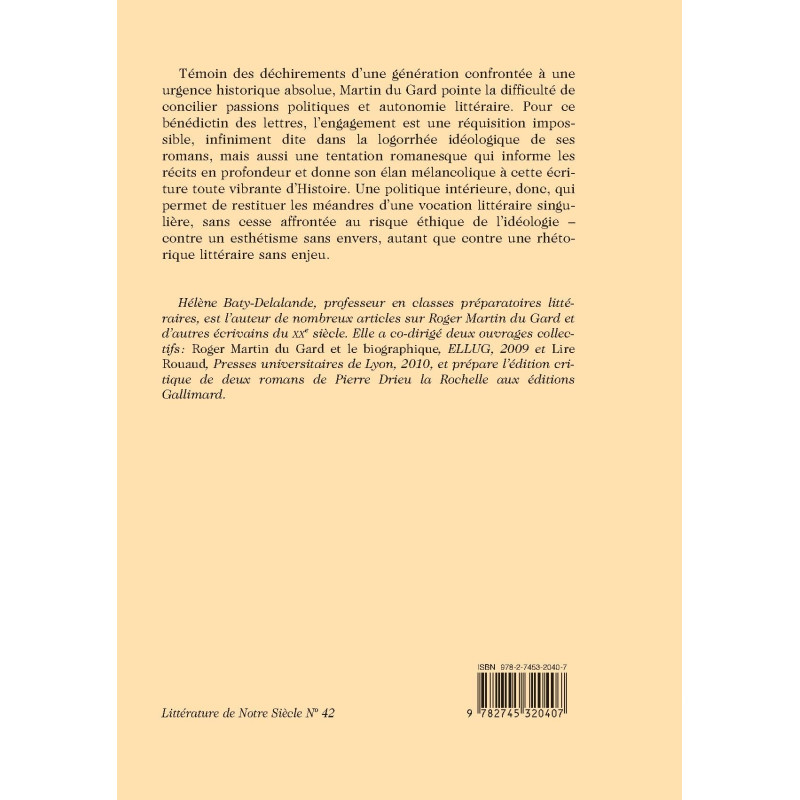 Témoin des déchirements d'une génération confrontée à une urgence historique absolue, Martin du Gard pointe la difficulté de concilier passions politiques et autonomie littéraire. Pour ce bénédictin des lettres, l'engagement est une réquisition impossible, infiniment dite dans la logorrhée idéologique de ses romans, mais aussi une tentation romanesque qui informe les récits en profondeur et donne son élan mélancolique à cette écriture toute vibrante d'Histoire. Une politique intérieure, donc, qui permet de restituer les méandres d'une vocation littéraire singulière, sans cesse affrontée au risque éthique de l'idéologie - contre une esthétique sans envers, autant que contre une rhétorique littéraire sans enjeu.