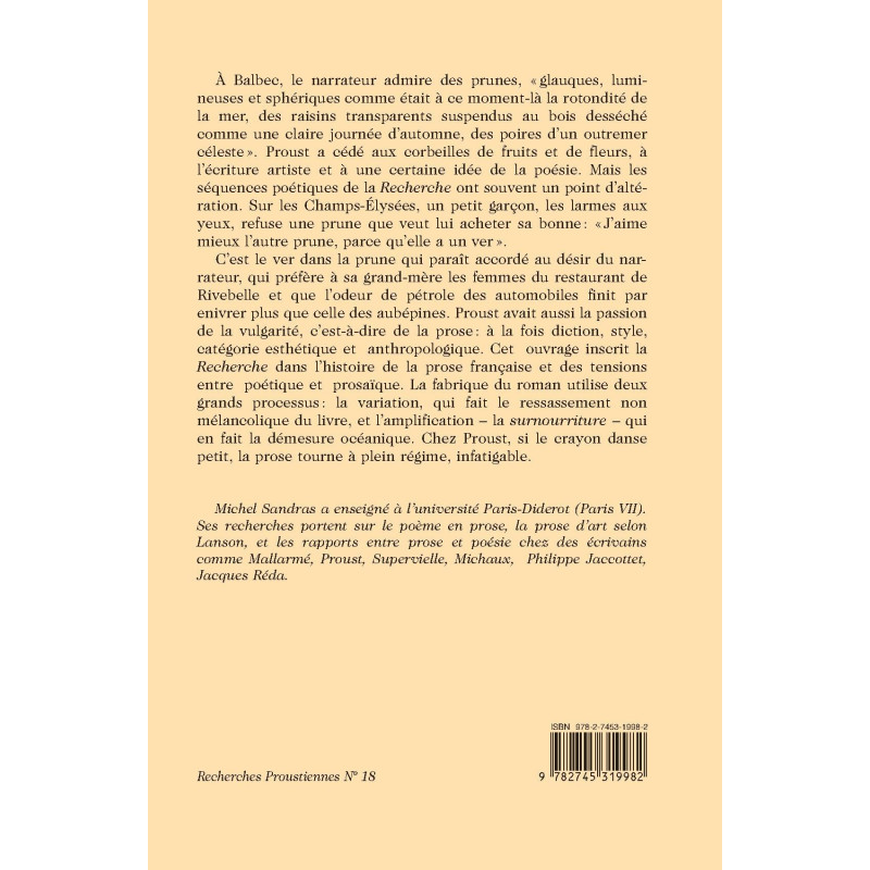 À Balbec, le narrateur admire des prunes, " glauques, lumineuses et sphériques comme était à ce moment-là la rotondité de la mer, des raisins transparents suspendus au bois desséché comme une claire journée d`automne, des poires d`un outremer céleste ". Proust a cédé aux corbeilles de fruits et de fleurs, à l`écriture artiste et à une certaine idée de la poésie. Mais les séquences poétiques de la Recherche ont souvent un point d`altération. Sur les Champs-Élysées, un petit garçon, les larmes aux yeux, refuse une prune que veut lui acheter sa bonne : " J`aime mieux l`autre prune, parce qu`elle a un ver ". C`est le ver dans la prune qui paraît accordé au désir du narrateur, qui préfère à sa grand-mère les femmes du restaurant de Rivebelle et que l`odeur de pétrole des automobiles finit par enivrer plus que celle des aubépines. Proust avait aussi la passion de la vulgarité, c`est-à-dire de la prose : à la fois diction, style, catégorie esthétique et anthropologique. Cet ouvrage inscrit la Recherche dans l`histoire de la prose française et des tensions entre poétique et prosaïque. La fabrique du roman utilise deux grands processus : la variation, qui fait le ressassement non mélancolique du livre, et l`amplification - la surnourriture - qui en fait la démesure océanique. Chez Proust, si le crayon danse petit, la prose tourne à plein régime, infatigable. Michel Sandras a enseigné à l`université Paris-Diderot (Paris VII). Ses recherches portent sur le poème en prose, la prose d`art selon Lanson, et les rapports entre prose et poésie chez des écrivains comme Mallarmé, Proust, Supervielle, Michaux, Philippe Jaccottet, Jacques Réda.
