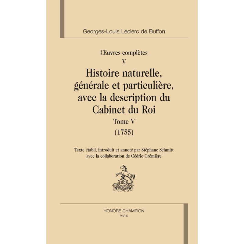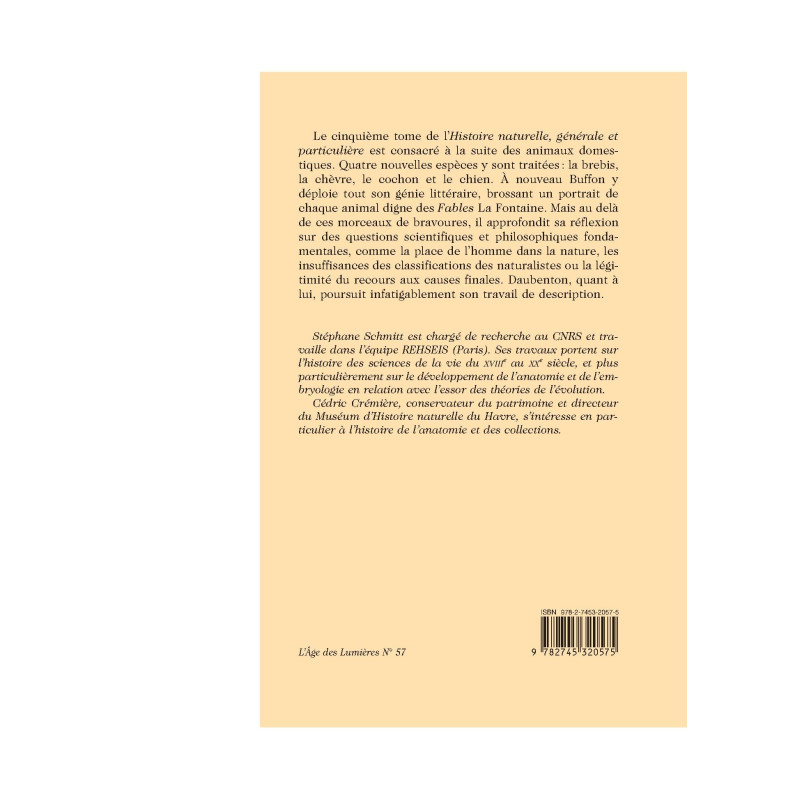 Le cinquième tome de l`Histoire naturelle, générale et particulière est consacré à la suite des animaux domestiques. Quatre nouvelles espèces y sont traitées : la brebis, la chèvre, le cochon et le chien. À nouveau Buffon y déploie tout son génie littéraire, brossant un portrait de chaque animal digne des Fables La Fontaine. Mais au delà de ces morceaux de bravoures, il approfondit sa réflexion sur des questions scientifiques et philosophiques fondamentales, comme la place de l`homme dans la nature, les insuffisances des classifications des naturalistes ou la légitimité du recours aux causes finales. Daubenton, quant à lui, poursuit infatigablement son travail de description. Stéphane Schmitt est chargé de recherche au CNRS et travaille dans l`équipe REHSEIS (Paris). Ses travaux portent sur l`histoire des sciences de la vie du XVIIIe au XXe siècle, et plus particulièrement sur le développement de l`anatomie et de l`embryologie en relation avec l`essor des théories de l`évolution. Cédric Crémière, conservateur du patrimoine et directeur du Muséum d`Histoire naturelle du Havre, s`intéresse en particulier à l`histoire de l`anatomie et des collections.