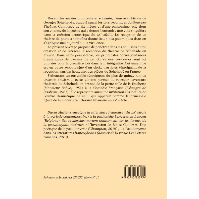 During the fifties and sixties the theatrical works of Georges Schehadé (1905-1989) were the most renowned ones in regard to the Nouveau Théâtre. This study looks at the reception of the plays by Schehadé in France. It includes for the first time the entire work of La Soirée des proverbes and invites the reader to appreciate the works of this Lebanese playwright and poet.