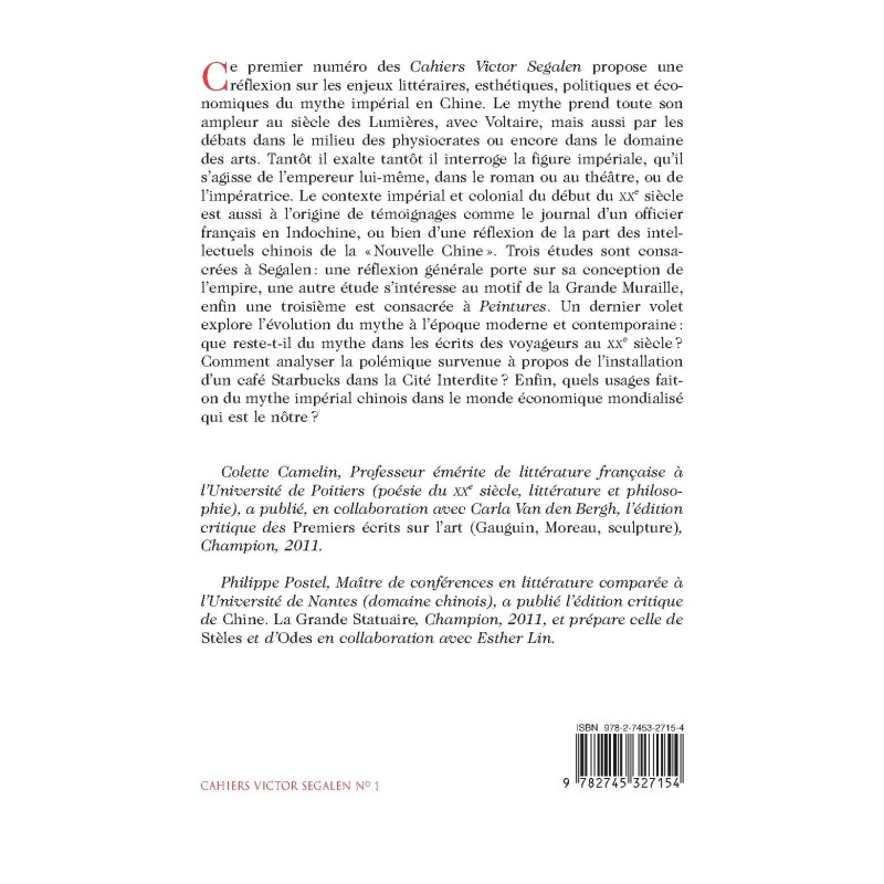 Ce premier numéro des « Cahiers Victor Segalen » propose une réflexion sur les enjeux littéraires, esthétiques, politiques et économiques du mythe impérial en Chine. Le mythe prend toute son ampleur au siècle des Lumières, avec Voltaire, mais aussi par les débats dans le milieu des physiocrates ou encore dans le domaine des arts. Tantôt il exalte tantôt il interroge la figure impériale, qu’il s’agisse l’empereur lui-même, dans le roman ou au théâtre, ou de l’impératrice. Le contexte impérial et colonial du début du XXe siècle est aussi à l’origine de témoignages comme le journal d’un officier français en Indochine, ou bien d’une réflexion de la part des intellectuels chinois de la «Nouvelle Chine ». Trois études sont consacrées à Segalen : une réflexion générale porte sur sa conception de l’empire, une autre étude s’intéresse au motif de la Grande Muraille, enfin une troisième est consacrée à « Peintures ». Un dernier volet explore l’évolution du mythe à l’époque moderne et contemporaine : que reste-t-il du mythe dans les écrits des voyageurs au XXe siècle ? Comment analyser la polémique survenue à propos de l’installation d’un café Starbucks dans la Cité Interdite ? Enfin, quels usages fait-on du mythe impérial chinois dans le monde économique mondialisé qui est le nôtre ?