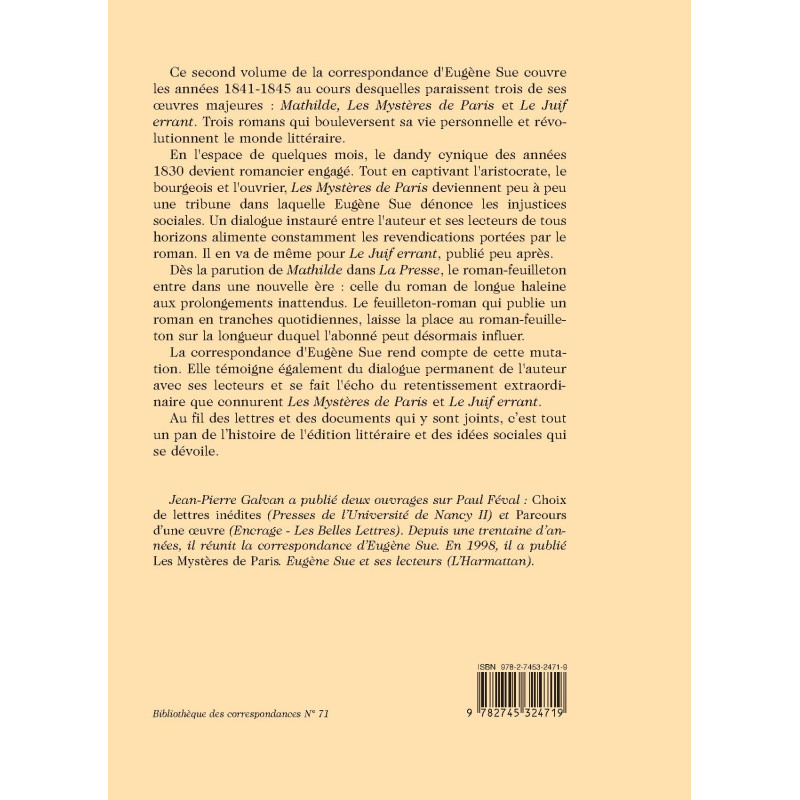 Ce second volume de la correspondance d`Eugène Sue couvre les années 1841-1845 au cours desquelles paraissent trois de ses œuvres majeures : « Mathilde, Les Mystères de Paris » et « Le Juif errant ». Trois romans qui bouleversent sa vie personnelle et révolutionnent le monde littéraire. En l`espace de quelques mois, le dandy cynique des années 1830 devient romancier engagé. Tout en captivant l`aristocrate, le bourgeois et l`ouvrier, « Les Mystères de Paris » deviennent peu à peu une tribune dans laquelle Eugène Sue dénonce les injustices sociales. Un dialogue instauré entre l`auteur et ses lecteurs de tous horizons alimente constamment les revendications portées par le roman. Il en va de même pour « Le Juif errant », publié peu après. Dès la parution de « Mathilde » dans « La Presse », le roman-feuilleton entre dans une nouvelle ère : celle du roman de longue haleine aux prolongements inattendus. Le feuilleton-roman qui publie un roman en tranches quotidiennes, laisse la place au roman-feuilleton sur la longueur duquel l`abonné peut désormais influer. La correspondance d`Eugène Sue rend compte de cette mutation. Elle témoigne également du dialogue permanent de l`auteur avec ses lecteurs et se fait l`écho du retentissement extraordinaire que connurent « Les Mystères de Paris » et « Le Juif errant ». Au fil des lettres et des documents qui y sont joints, c’est tout un pan de l’histoire de l`édition littéraire et des idées sociales qui se dévoile.