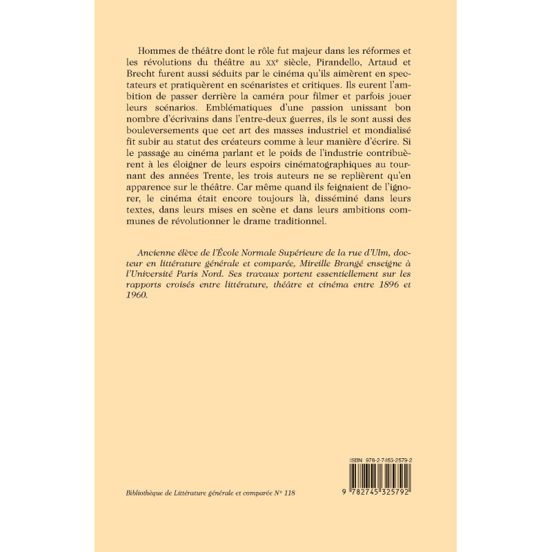 Pirandello, Artaud and Brecht were seduced by cinema, which they practiced it as scriptwriters and reviewers. Even when, starting in the 30s, they pretended to ignore film, it influenced their approaches to theatre – through their directorial style and their common ambition to revolutionize traditional drama.