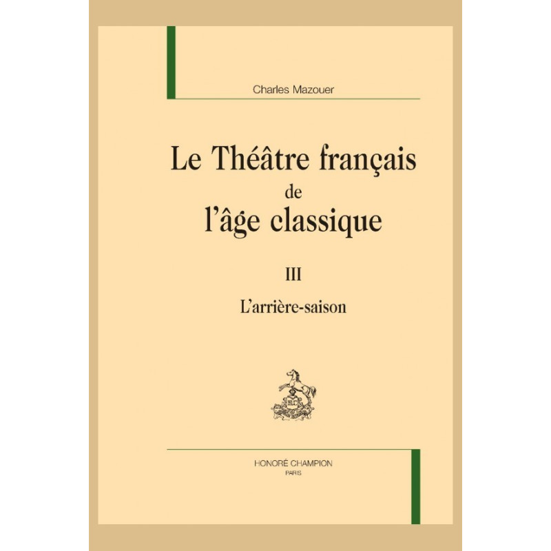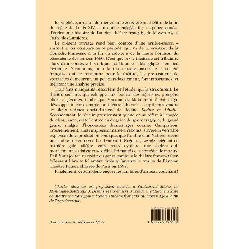This final volume of a history of French theater from the Middle Ages to the eve of the Enlightenment focuses on the last years of Louis XIV’s reign. Within an unfavorable political and ideological context, educational (esp. Jesuit) and comic theater thrive, while tragedy falls out of fashion.