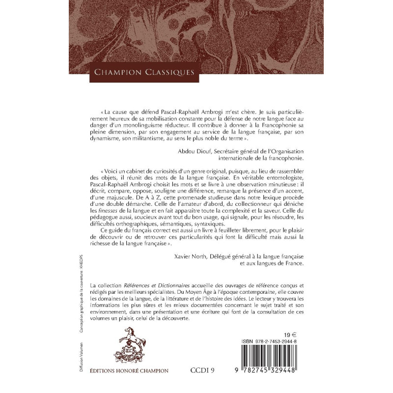 This dictionary reads like a curiosity cabinet of French words. Its approach is twofold: that of the collector, who digs up the finer points of the French language to reveal its complex beauty, and that of the pedagogue, who points out delicate issues of spelling, semantics and syntax to ensure correct usage.