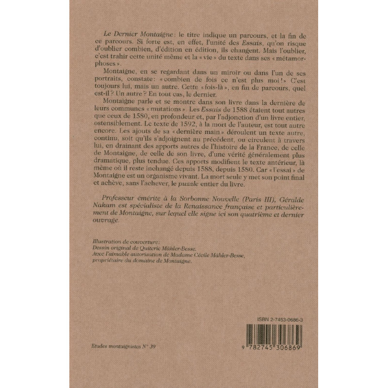 Le Dernier Montaigne: le titre indique un parcours, et la fin de ce parcours. Si forte est, en effet, l'unité des Essais, qu'on risque d'oublier combien, d'édition en édition, ils changent. Mais l'oublier, c'est trahir cette unité même et la "vie" du texte dans ses "métamorphoses".