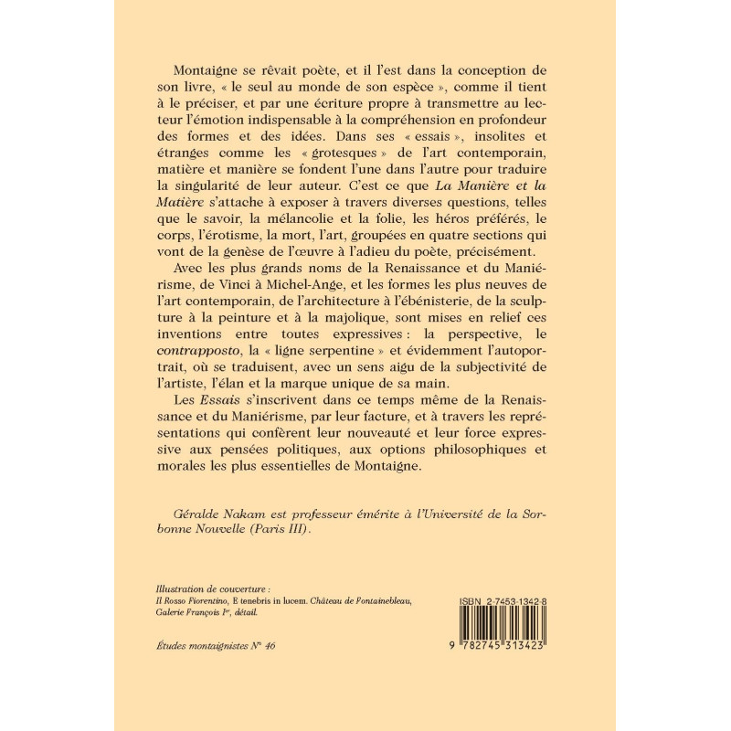 Montaigne se rêvait poète, et il l'est dans la conception de son livre, "le seul au monde de son espèce", comme il tient à le préciser, et par une écriture propre à transmettre au lecteur l'émotion indispensable à la compréhension en profondeur des formes et des idées. Dans ses "essais", insolites et étranges comme les "grotesques" de l'art contemporain, matière et manière se fondent l'une dans l'autre pour traduire la singularité de leur auteur. C'est ce que La manière et la Matière s'attache à exposer à travers diverses questions, telles que le savoir, la mélancolie et la folie, les héros préférés, le corps, l'érotisme, la mort, l'art, groupées en quatre sections qui vont de la genèse de l'œuvre à l'adieu du poète, précisément.