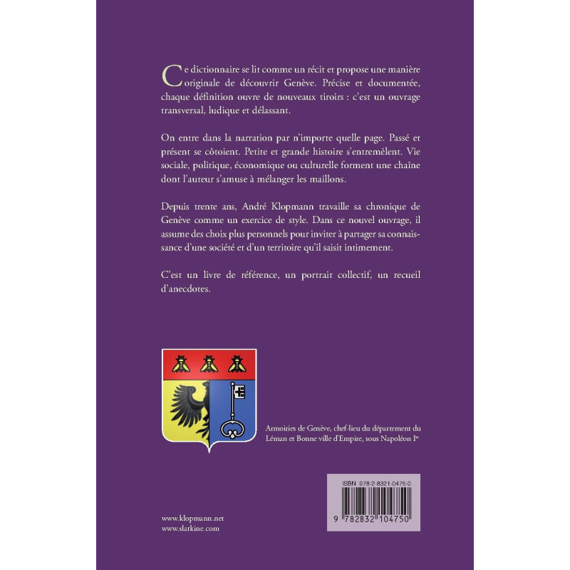 Ce dictionnaire se lit comme un récit et propose une manière originale de découvrir Genève. Précise et documentée, chaque définition ouvre de nouveaux tiroirs : c`est un ouvrage transversal, ludique et délassant. On entre dans la narration par n`importe quelle page. Passé et présent se côtoient. Petite et grande histoire s`entremêlent. Vie sociale, politique, économique ou culturelle forment une chaîne dont l`auteur s`amuse à mélanger les maillons. Depuis trente ans, André Klopmann travaille sa chronique de Genève comme un exercice de style. Dans ce nouvel ouvrage, il assume des choix plus personnels pour inviter à partager sa connaissance d`une société et d`un territoire qu`il saisit intimement. C`est un livre de référence, un portrait collectif, un recueil d`anecdotes.