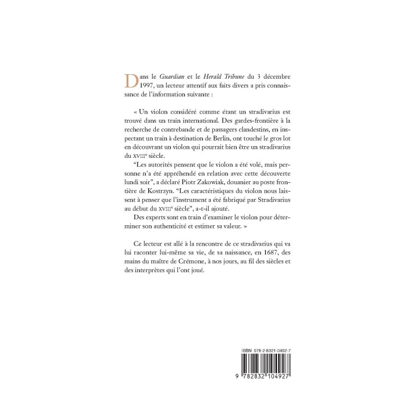 Dans le Guardian et le Herald Tribune du 3 décembre 1997, un lecteur attentif aux faits divers a pris connaissance de l’information suivante : « Un violon considéré comme étant un stradivarius est trouvé dans un train international. Des gardes-frontière à la recherche de contrebande et de passagers clandestins, en inspectant un train à destination de Berlin, ont touché le gros lot en découvrant un violon qui pourrait bien être un stradivarius du XVIIIe siècle. “Les autorités pensent que le violon a été volé, mais personne n’a été appréhendé en relation avec cette découverte lundi soir”, a déclaré Piotr Zakowiak, douanier au poste frontière de Kostrzyn. “Les caractéristiques du violon nous laissent à penser que l’instrument a été fabriqué par Stradivarius au début du XVIIIe siècle”, a-t-il ajouté. Des experts sont en train d’examiner le violon pour déterminer son authenticité et estimer sa valeur. » Ce lecteur est allé à la rencontre de ce stradivarius qui va lui raconter lui-même sa vie, de sa naissance, en 1687 lorsqu’il naît des mains du maître de Crémone, à nos jours, au fil des siècles et des interprètes qui l’ont joué.
