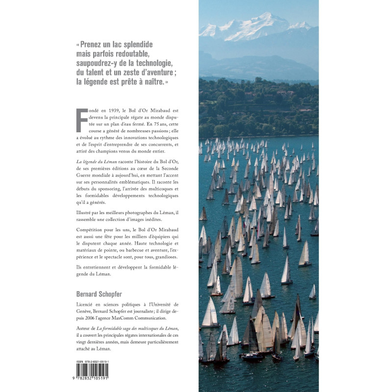 Fondé en 1939, le Bol d’Or Mirabaud est devenu la plus importante régate au monde disputée sur un plan d’eau fermé. En 75 ans, cette course à nulle autre pareille a généré de très nombreuses passions ; elle a évolué au rythme des innovations technologiques et de l’esprit d’entreprendre de ses concurrents, et attiré des champions venus du monde entier. La légende du Léman situe le Bol d’Or Mirabaud dans sa perspective historique. Il décrit les premières éditions de la course, au cœur de la Seconde Guerre mondiale, et met l’accent sur ses personnalités emblématiques. Richement illustré, le récit décrit les nombreuses péripéties qui ont forgé son histoire. Il relate les débuts du sponsoring, l’arrivée des multicoques et les formidables développements technologiques qu’il a générés. Compétition pour les uns, le Bol d’Or Mirabaud est aussi une fête pour les centaines d’équipiers qui le disputent chaque année. Haute technologie et matériaux de pointe, ou barbecue et aventure, l’expérience et le spectacle sont, pour tous, grandioses. Ils entretiennent et développent la formidable légende du Léman. 4 Licencié en sciences politiques à l’Université de Genève, Bernard Schopfer est journaliste ; il a notamment participé au lancement du Nouveau Quotidien et travaillé à la Télévision Suisse Romande. Passionné de voile, et amoureux du Léman, il a couvert les principales régates de ces vingt dernières années, sur le lac et dans le monde entier, en tant que journaliste et réalisateur TV, puis en qualité de responsable de la communication pour des projets d’envergure internationale, avant de fonder l’agence MaxComm Communication en 2006. Il est l’auteur de La formidable saga des multicoques du Léman.