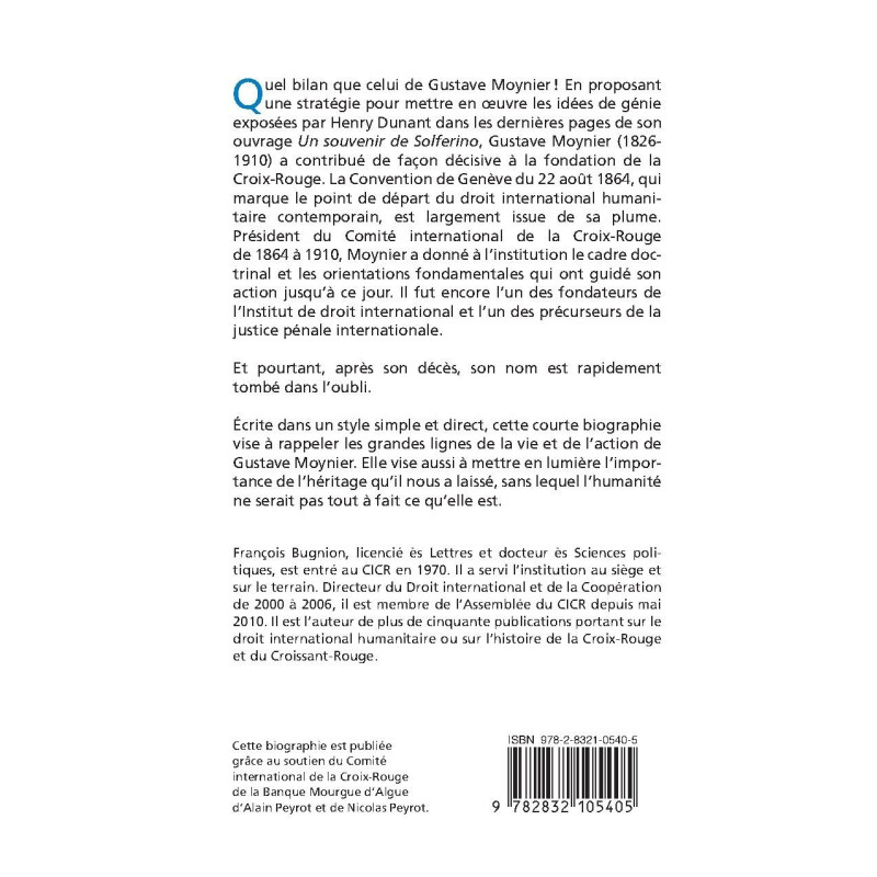 Peut-on imaginer un destin plus exceptionnel et plus tragique que celui d`Henry Dunant? Confronté à l`horreur du champ de bataille de Solférino, il sut tirer de ce traumatisme un livre-témoignage - Un souvenir de Solferino - ainsi que deux idées de génie - la Croix-Rouge et la Convention de Genève - qui lui permettront d`accéder à la notoriété. Il n`en jouira pas longtemps. En 1867, une faillite retentissante le plonge dans la misère. Après avoir été invité à la table des Grands, Dunant connaîtra la faim et l`humiliation des habits rapiécés. Cette déchéance ne l`empêchera pourtant pas de se faire l`avocat d`autres idées généreuses : la protection des prisonniers de guerre, un projet de bibliothèque universelle, les droits des femmes, l`arbitrage international, etc. Après des années d`exil, d`errances et de privations, il saura orchestrer une stratégie de reconquête qui culminera en 1901 avec l`octroi du premier prix Nobel de la paix. Il s`éteint à Heiden le 30 octobre 1910. Cette courte biographie vise à présenter les aspects essentiels du philanthrope : ses qualités de visionnaire, ses élans d`enthousiasme et de générosité; sans occulter ses égarements, ses travers et le délire de persécution qui assombrit ses dernières années. Elle vise surtout à rappeler l`héritage de Dunant, qui fait honneur à l`humanité. // Quel bilan que celui de Gustave Moynier! En proposant une stratégie pour mettre en œuvre les idées de génie exposées par Henry Dunant dans les dernières pages de son ouvrage Un souvenir de Solferino, Gustave Moynier (1826- 1910) a contribué de façon décisive à la fondation de la Croix-Rouge. La Convention de Genève du 22 août 1864, qui marque le point de départ du droit international humanitaire contemporain, est largement issue de sa plume. Président du Comité international de la Croix-Rouge de 1864 à 1910, Moynier a donné à l`institution le cadre doctrinal et les orientations fondamentales qui ont guidé son action jusqu`à ce jour. Il fut encore l`un des fondateurs de l`Institut de droit international..