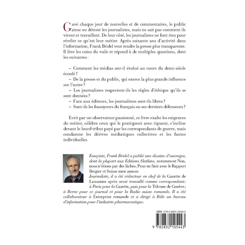 Gavé chaque jour de nouvelles et de commentaires, le public aime ou déteste les journalistes, mais ne sait pas comment ils vivent et travaillent. De leur côté, les journalistes ne font rien pour révéler ce qu’est leur métier. Après soixante ans d’activité dans l’information, Frank Bridel veut rendre la presse plus transparente. Il lève les coins du voile et répond à de multiples questions, dont les suivantes :